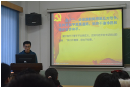 会议首先进行了抗战历史学习,由支部第二小组的同学做汇报。2015年9月3日是中国人民抗日战争暨世界反法西斯战争胜利70周年的日子,该天上午在天安门广场举行了盛大的纪念阅兵仪式。作为一名研究生党员,我们更应当深刻铭记抗日战争胜利的伟大意义。首先仇程希同学从1931年九一八事变开始至1945年8月抗战结束回顾了中国的抗战历史。接着,宋晓璇和任勇军分别汇报了中国抗战历史中的国际外援以及交大的抗战历史。其次,刘文才同学分享了他对抗战胜利70周年大会上习近平总书记讲话的感想。最后,秦伟超对小组学习做了总结并提出了三点启示:必须始终不渝地坚持中国共产党领导;必须坚持走中国特色社会主义道路;必须旗帜鲜明地反对战争,坚持走和平发展道路。