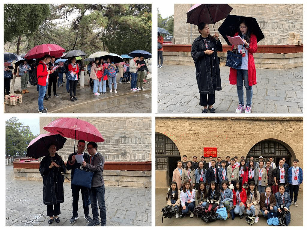 4月20日上午,学员们来到宝塔山,山顶的宝塔是延安的标志,也是革命圣地的象征。俯瞰延安城,追忆革命史,感受这座历经风霜而不倒的宝塔在中国革命历程中的领航地位。途中是陈毅将军写就的延安宝塔歌——“延安有宝塔,巍巍高山上。高耸入云端,塔尖指方向。红日照白雪,万众齐仰望。”细雨迷蒙,黑云压顶,却也遮不住不尽壮志忠心满怀。营员们在山顶鲜红的党旗前,高唱《保卫黄河》、《我们走在大路上》等红歌,是歌谣,更是心声;朗诵贺敬之的《回延安》。,追忆革命先辈不畏困难、砥砺前行、艰苦奋斗、开拓创新的精神,数以万计的爱国青年克服重重困难奔赴延安,为家国撒热血的精神在营员心中留下深深烙印,鞭策着后辈奋发报国。
