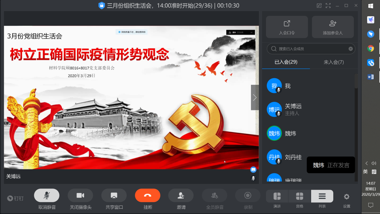 3月29日,硕8016+8017党支部开展了以“树立正确国际疫情形势观念”为主题的支部生活会。受疫情限制,此次会议依然采用了以钉钉为平台的线上会议模式。会议由支部书记关博远主持,支部党员、积极分子参与了会议;会议特别邀请了诸侯快讯ok133副书记魏炜 、辅导员黄小燕以及9016+9018党支部支委参加。
