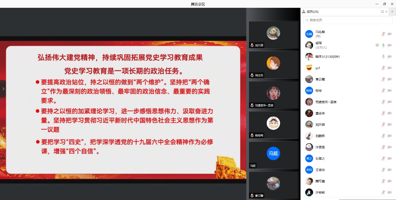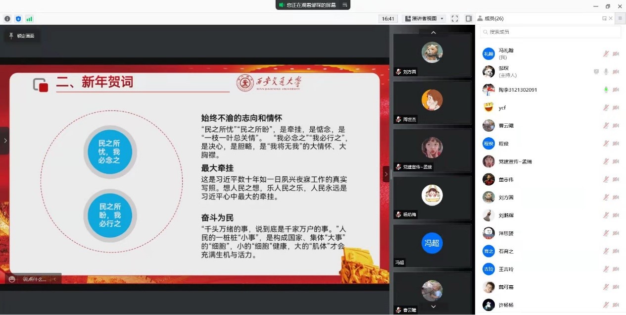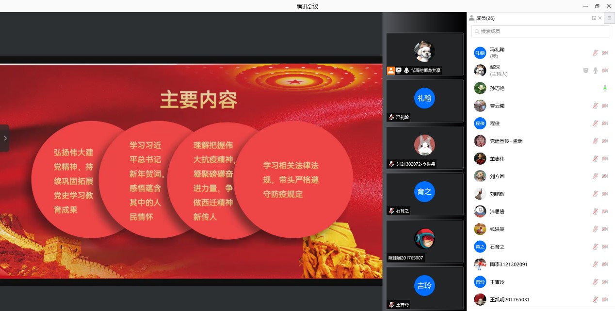 为深入贯彻落实习近平总书记和党中央、教育部及学校党委关于疫情防控工作的决策部署,学习习近平总书记新年贺词,感悟蕴含其中的人民情怀。持续巩固拓展党史学习教育成果,理解把握伟大抗疫精神,凝聚磅礴奋进力量,争做西迁精神新传人,充分发挥党支部战斗堡垒作用和党员先锋模范作用。硕1023+1024党支部在1月14号,通过腾讯会议召开1月份线上党组织生活会议。分党委委员孙巧艳出席会议,党员全部参会,积极分子们也积极参加组织生活会并进行线上学习教育。由支部书记邹琛主持会议。