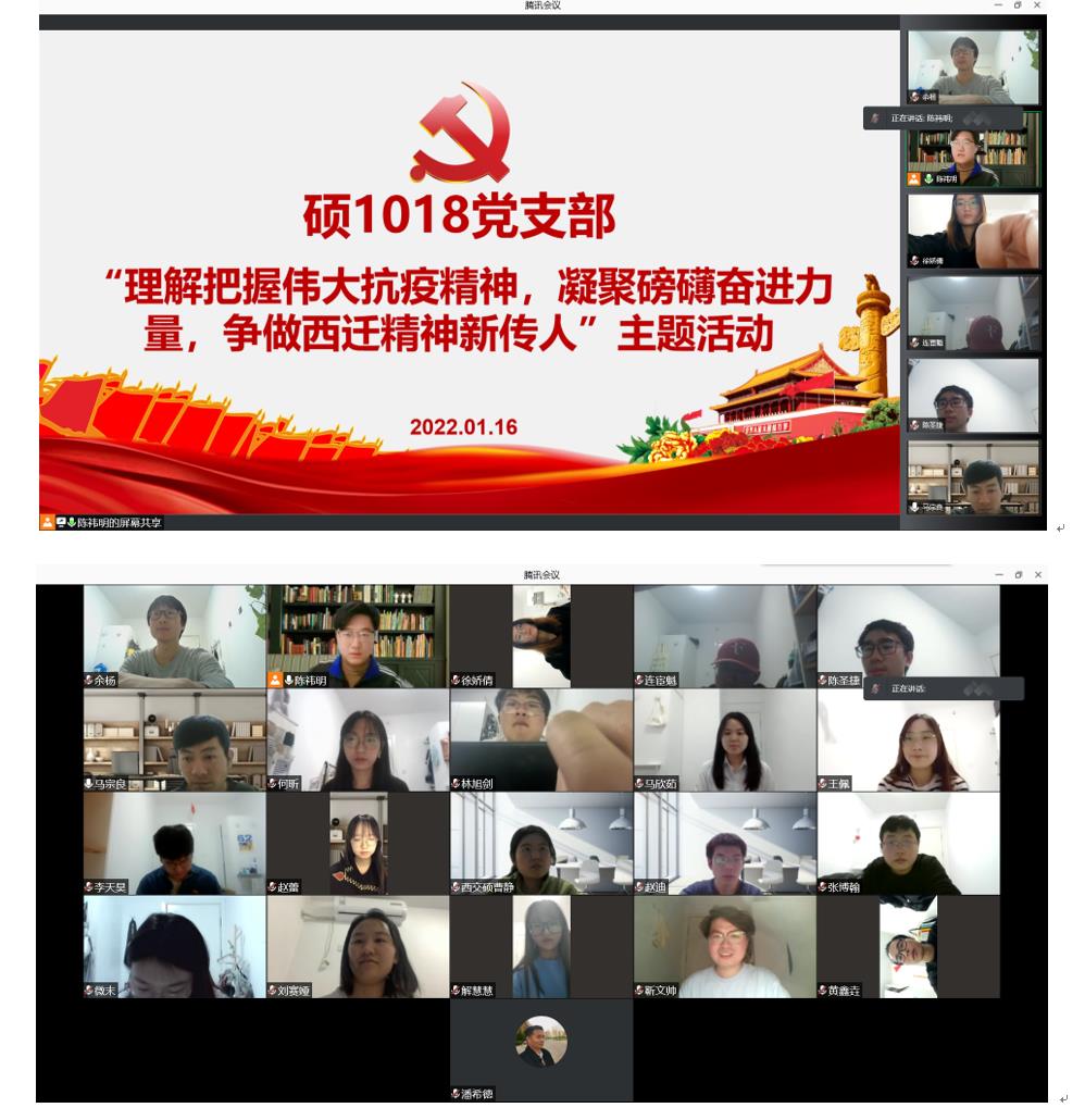 1月16日晚7点,硕1018党支部在线上开展党日主题活动——“理解伟大抗疫精神,凝聚磅礴奋进力量,争做西迁精神新传人”。会议旨在充分发挥党支部战斗堡垒作用和党员的先锋模范作用,保障教学科研等工作平稳运转。支部全体党员和积极分子参加本次会议,会议邀请诸侯快讯ok133党委书记潘希德同志参会指导,会议由硕1018党支部书记陈祎明同志主持。
