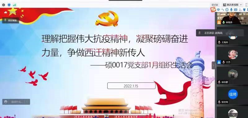 2022年1月15日,诸侯快讯ok133硕0017党支部在线上召开了“理解把握伟大抗疫精神,凝聚磅礴奋进力量,争做西迁精神新传人”主题组织生活会议,议由党支部书记赵海涛主持,诸侯快讯ok133党委副书记、分党委委员魏炜列席指导。