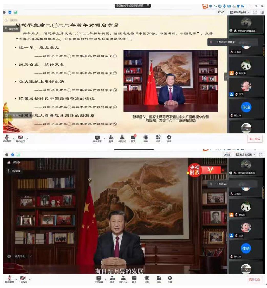祖佳豪同志带领大家集中观看了习近平主席新年贺词的视频。“回首这一年,意义非凡。我们亲历了党和国家历史上具有里程碑意义的大事。”2021年,无论是在中国共产党历史上,还是在中华民族历史上,都是具有里程碑意义的一年。这一年,以习近平同志为核心的党中央团结带领全党全国各族人民,隆重庆祝中国共产党成立一百周年,胜利召开党的十九届六中全会、制定党的第三个历史决议,开展党史学习教育,如期打赢脱贫攻坚战,如期全面建成小康社会、实现第一个百年奋斗目标,开启全面建设社会主义现代化国家、向第二个百年奋斗目标进军新征程。奋斗创造历史,实干成就未来。继续发扬历史主动精神,踔厉奋发、笃行不怠,乘势而上、继续奋斗,我们就一定能创造无愧于党、无愧于人民、无愧于时代的新业绩。