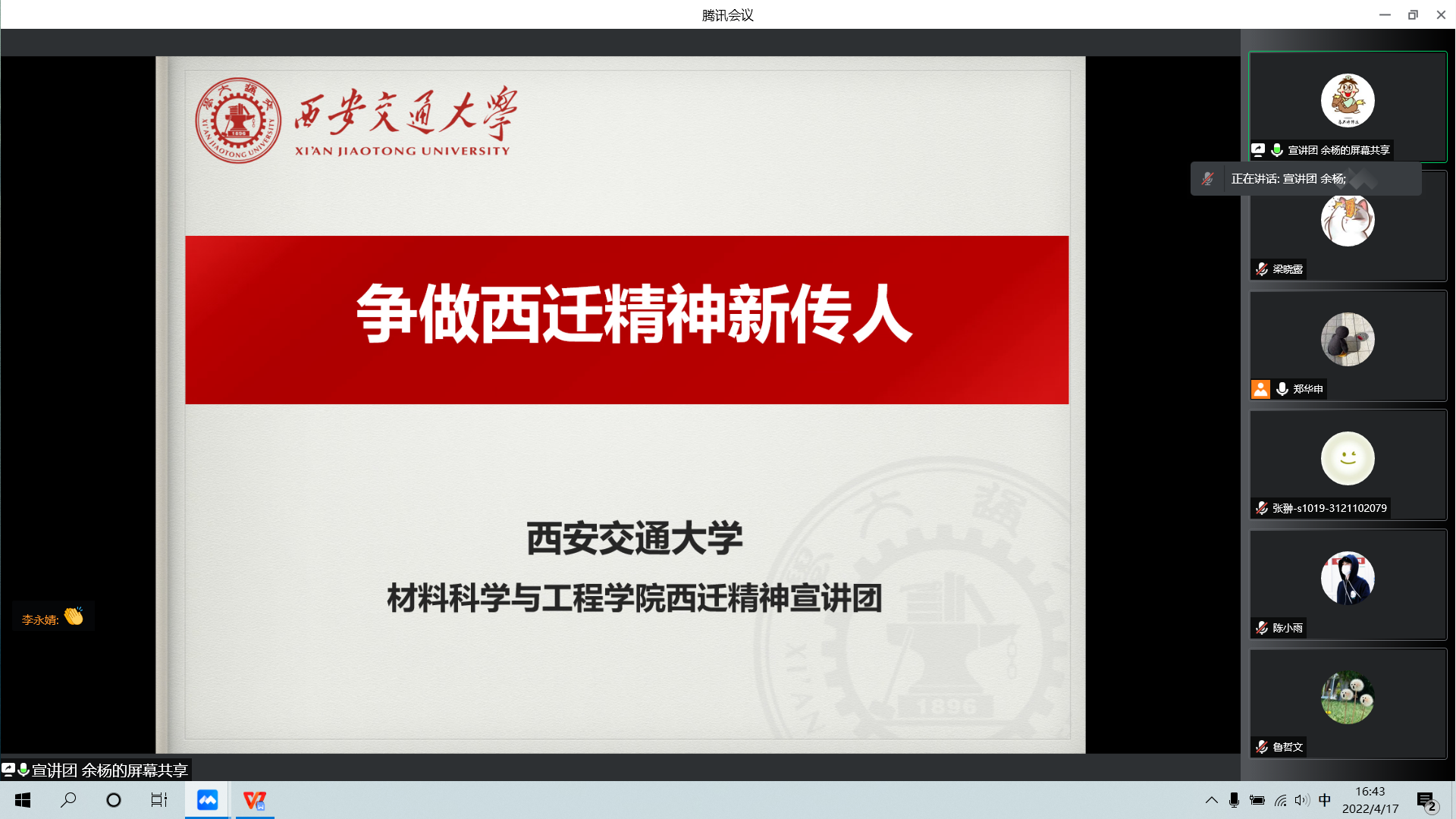 最后,张伟耀同志做了总结发言,其一:每一位交大人应当谨记西迁精神的核心与精髓,从交大西迁人身上汲取力量,奋斗前行;其二:冬奥会、新材料、中国制造2025三者是紧密相关的,大家的发言是有思考的、有深度的;其三,当前疫情形势依然严峻,但是大家应对疫情更有经验,党员同志们应当做好模范带头作用,积极带领积极分子乃至团员投身于志愿服务中。
