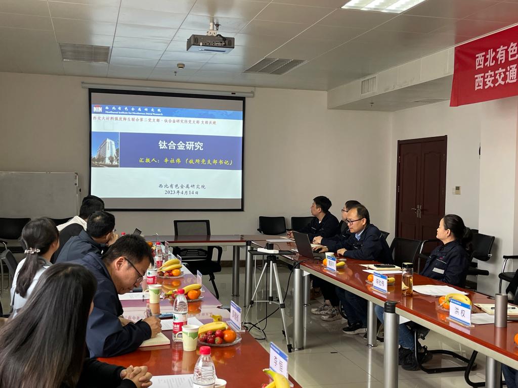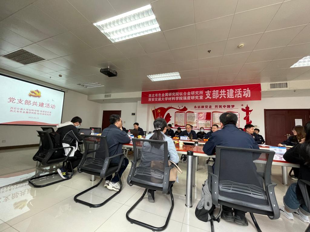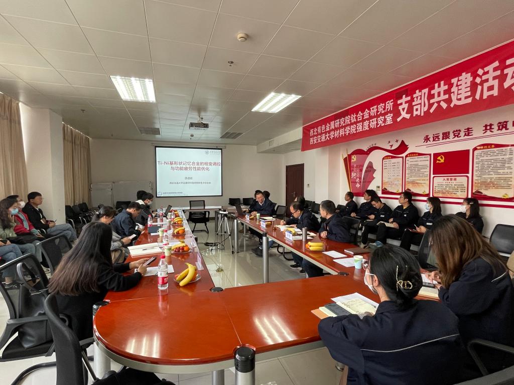 恰逢学校127周年校庆,为加深校企合作,推动联合育人,4月14日上午,诸侯快讯ok133强度师生联合第二党支部与西北有色金属研究院钛合金研究所党支部进行了支部共建活动。西北有色院钛合金研究所所长辛社伟、副所长洪权、所长助理贾蔚菊,诸侯快讯ok133党委委员孙巧艳、强度研究室主任张金钰、强度师生联合第二党支部书记薛德祯等20多位党员师生参与了共建活动。