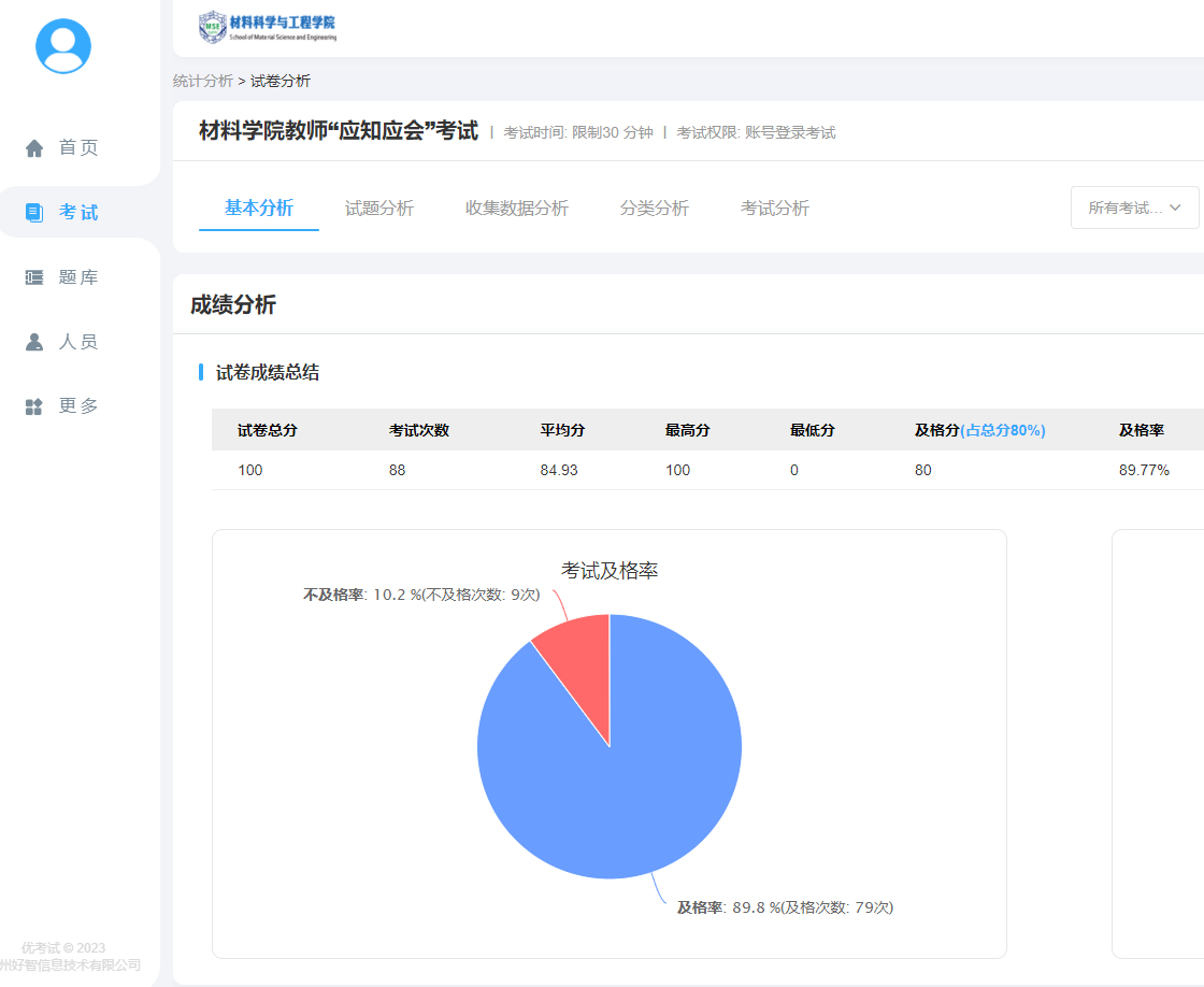 习近平总书记在党的二十大报告中指出,坚持为党育人、为国育才,全面提高人才自主培养质量。为丰富思政教育模式,推动思想政治工作改革创新,夯实育人物理载体,学院建设了“诸侯快讯ok133师生应知应会考试系统”,助力一流学科凝聚一批优秀老师,通过一套规范素材,解决师生急难愁盼的各项问题,做好保障服务,培养一代优秀接班人。该系统结合高校教学育人工作中的重点与难点,通过在线学习考试系统,面向本科生、研究生、青年教师开展阶段性知识考查,提高师生对应知应会内容的重视,内化于心、外化于行。并通过数据关联分析,形成匹配师生的分析报告,既指导个人工作学习,又为学院工作规划提供参考。通过“应知应会系统”强化师生思想政治教育,提升师生员工家国情怀,增强对学校、学院的归属感和使命感,胸怀“国之大者”,弘扬西迁精神,勇担国家使命,共创交大荣誉,在潜心科研、矢志创新、爱国奋斗、昂扬向上的文化氛围中团结奋斗,培育良才。