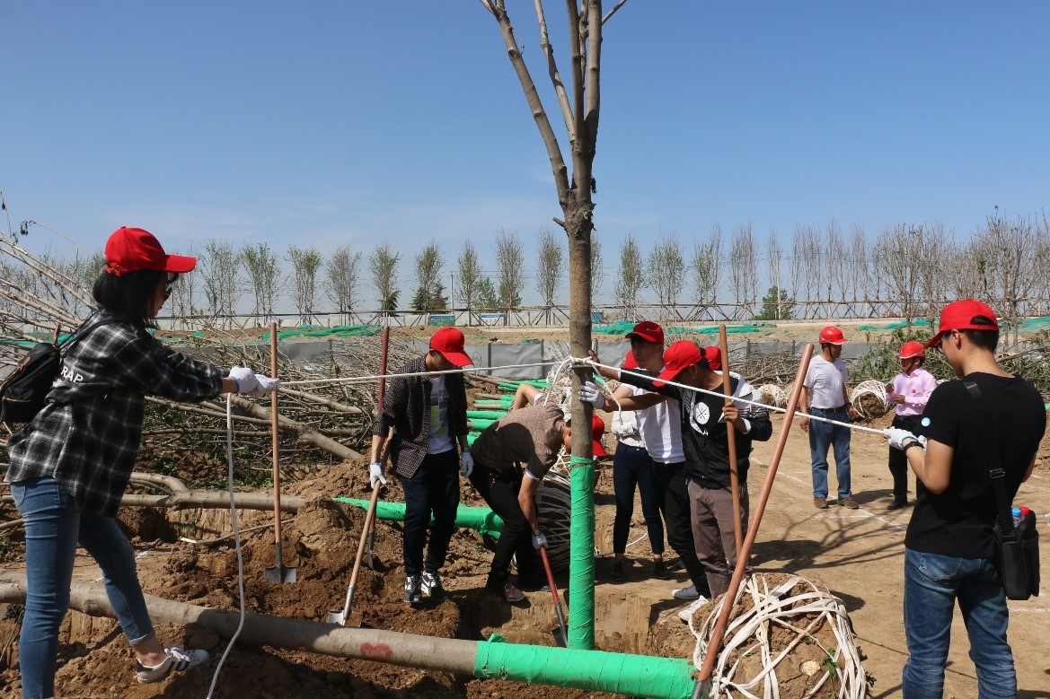 在专业人员的指导下,团队成员利用吊车将树吊起并调整角度移入坑内,在树干上绑好绳子后从三个方向拉紧固定,防止在填土过程中树干发生倾斜,最后在其表层土壤做出水圈进行浇水,按部就班完成植树工作。当第一棵树苗种植成功,学院研究生代表张庆庆同学激动的表示,“六十多年前,我们的前辈在交通大学本部校区种下的梧桐已经长成了参天大树,它们是交大西迁后历史的见证。今天,交大材料学子种下七叶树,伴随着它的茁壮成长,相信一定会成为西部创新港的崛起见证。”