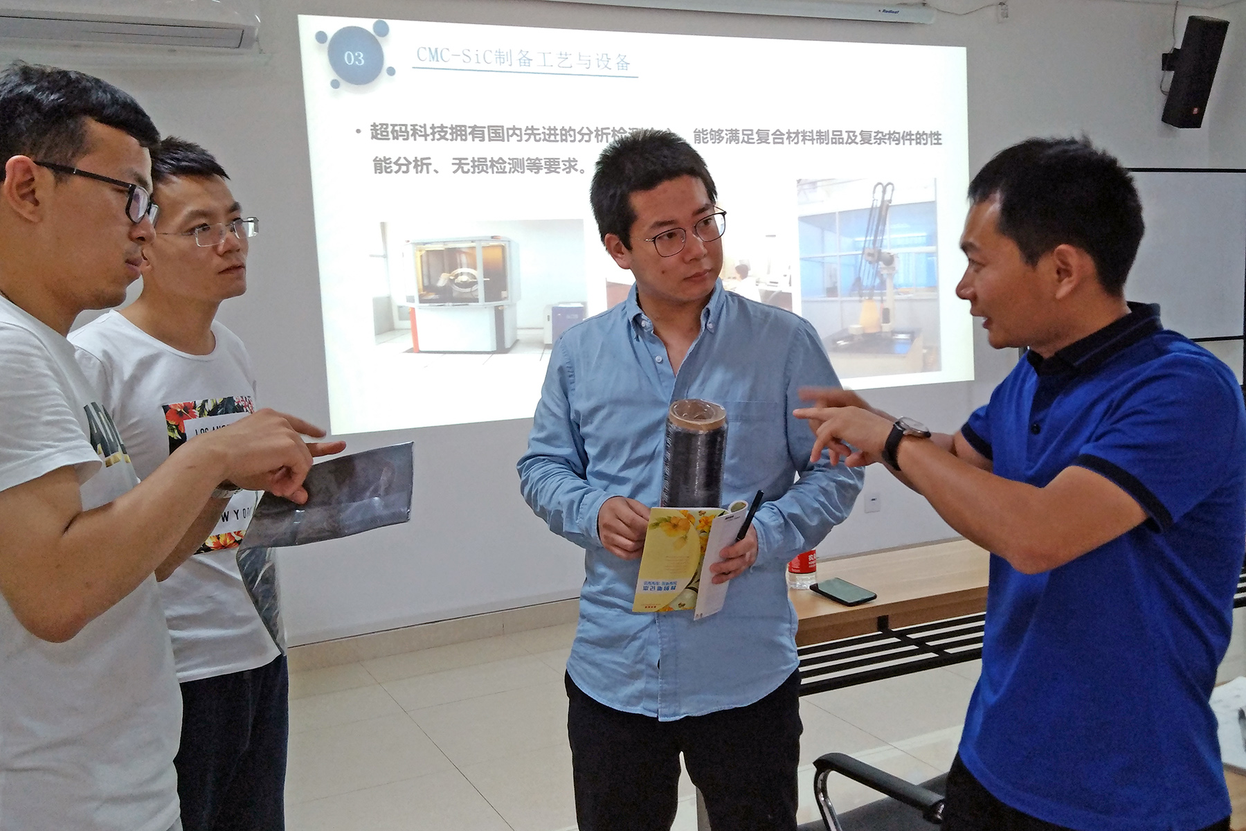 紧接着就讲了同学老师们最关注的问题,关于CMC-SiC材料材料的制备工艺以及工艺设备,张永辉博士讲解了超码科技公司所使用的技术原理,列举了很多技术,比如反应熔体渗透法、先驱体浸渍热解、化学气相渗透法等方法,并详细解释了各个方法的优缺点,这几种方法在学校实验室里各有涉及,对于师生而言具有很大的参考价值。而后讲解了超码科技有限公司所使用的技术和设备,并简单讲解了公司所能做出来的工艺,所能做出来的产品,以及先进的分析检测设备。