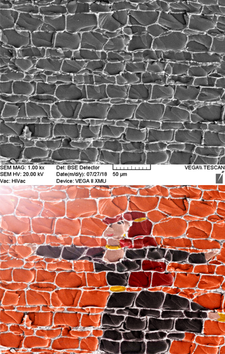特等奖作品《石墙上的舞者》采用钨灯丝扫描电镜对碳化硅/环氧树脂复合材料断口进行了拍摄,复合材料具有“砖墙”结构,经过原位碳热还原反应得到的多孔SiC完整保留了松木的多孔结构,在环氧树脂复合材料中形成连续的导热网络和承载骨架;碳化硅陶瓷经过表面改性后,与环氧树脂界面结合紧密,结构完整有序。经过对原图上色,在没有破坏原有结构的情况下得到这样的美丽场景:一缕轻柔的阳光顺着石墙洒落在这女子身上,她鸭蛋脸面,俊眼修眉,粉面上一点朱唇,神色间意气风发,一袭墨黑淡雅长裙,红发侧披如瀑,素颜清雅面庞淡然笑;她张开双臂,纤足轻点,衣决飘飘,宛若仙子一般,在阳光下旋转、跳跃。此刻,她是自由的,她冲破这象征着世俗与偏见的石墙,拥抱阳光,翩翩起舞。生命中有许许多多有形无形的石墙,它很坚硬,因为它代表着名利、世俗和心底的恐惧,打破它吧,寻找真正的自我。比赛现场各位评委对该作品给予了高度的评价,无论是从项目立意、创作、寓意以及科研背景都给予了一致好评。