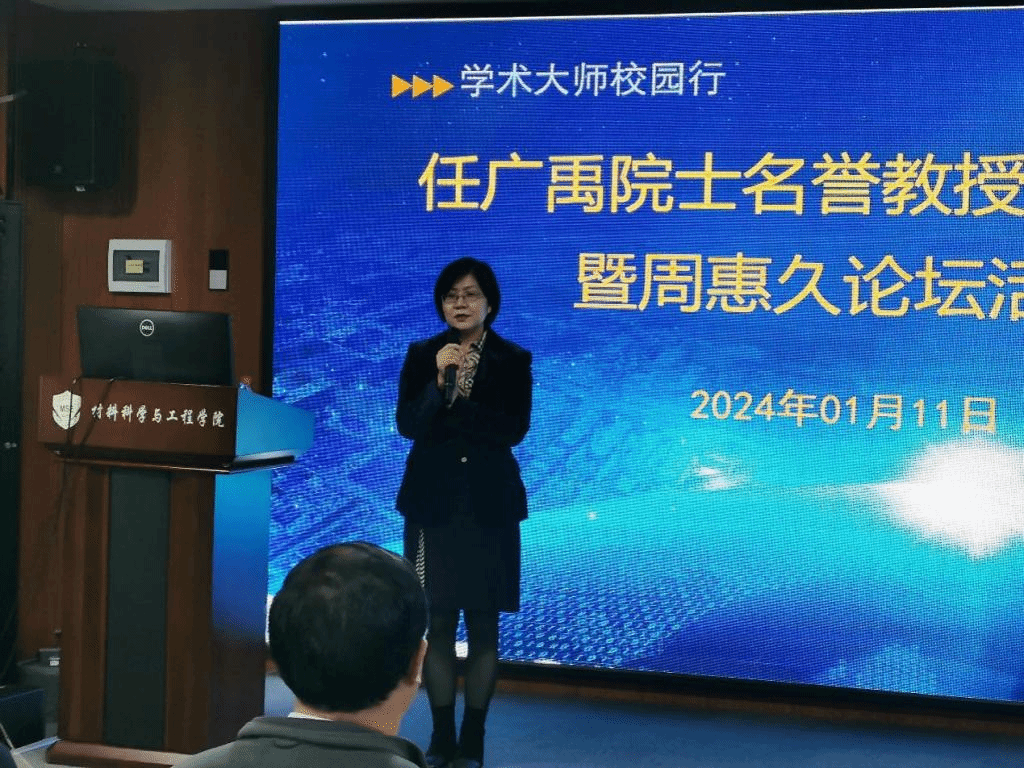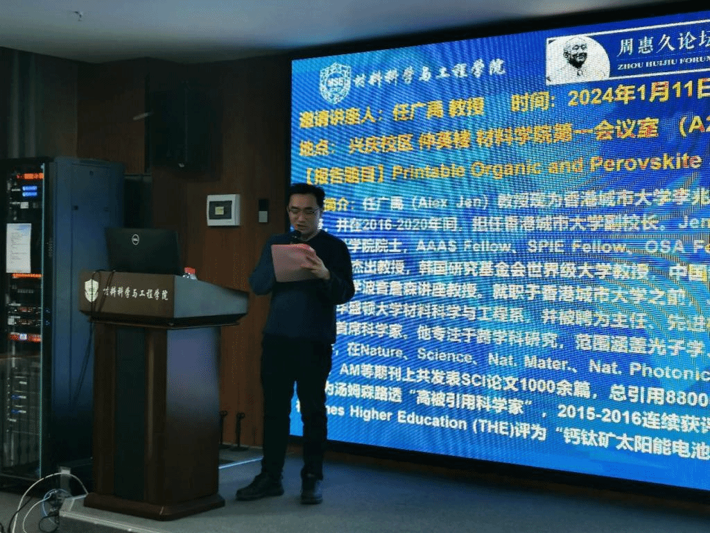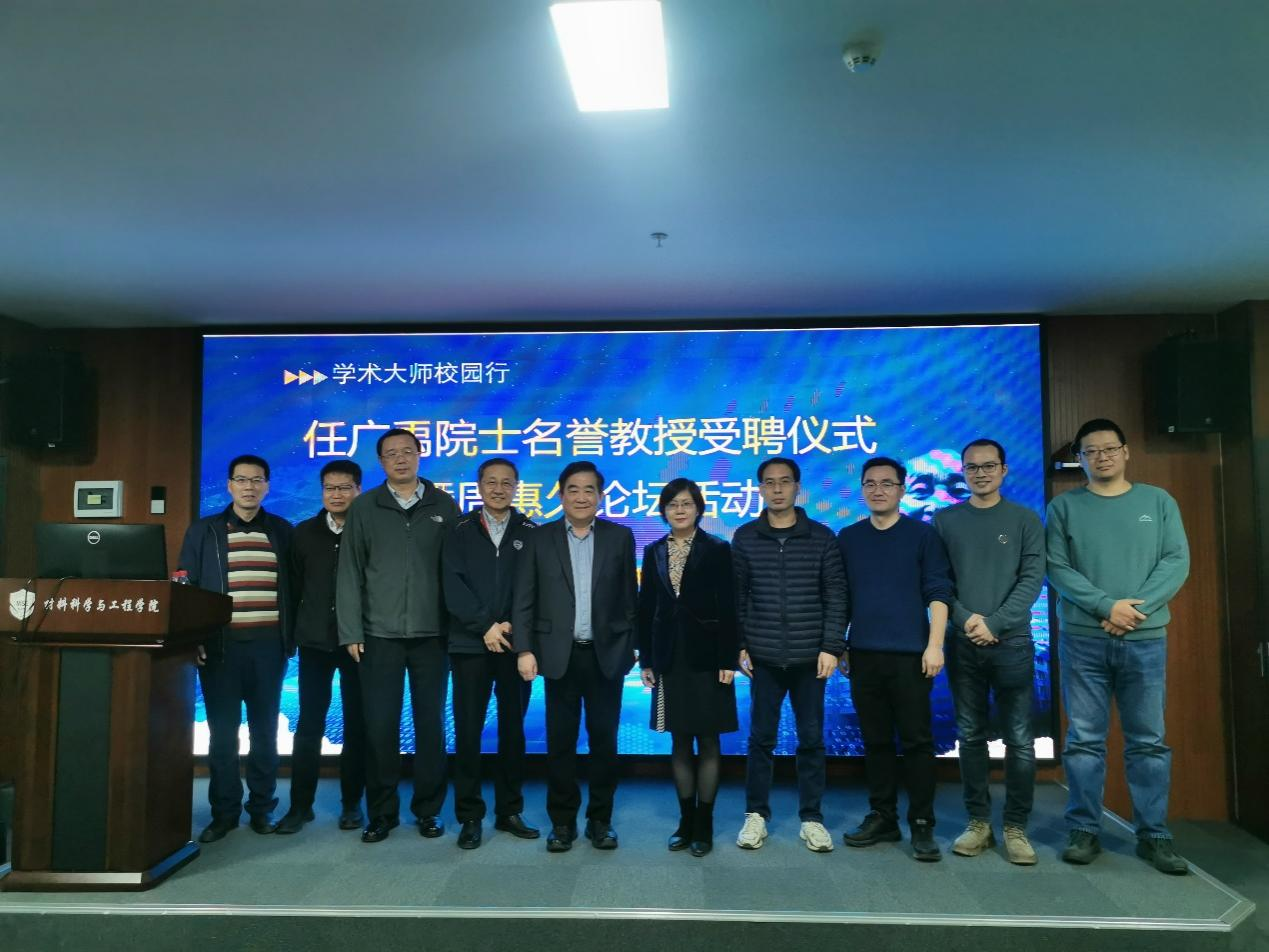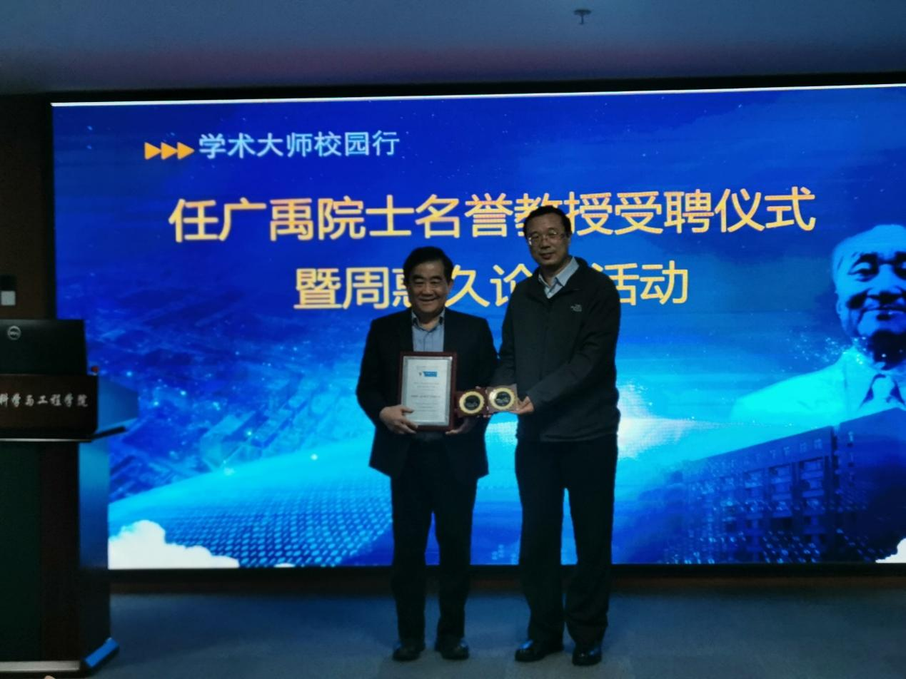 仪式结束后,在仲英楼第一会议室,任广禹院士为师生带来一场题为《Printable Organic and Perovskite Solar Cells for Clean Energy》的高水平学术报告,丁向东院长为任院士颁发周惠久论坛终身成就奖。