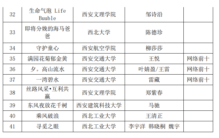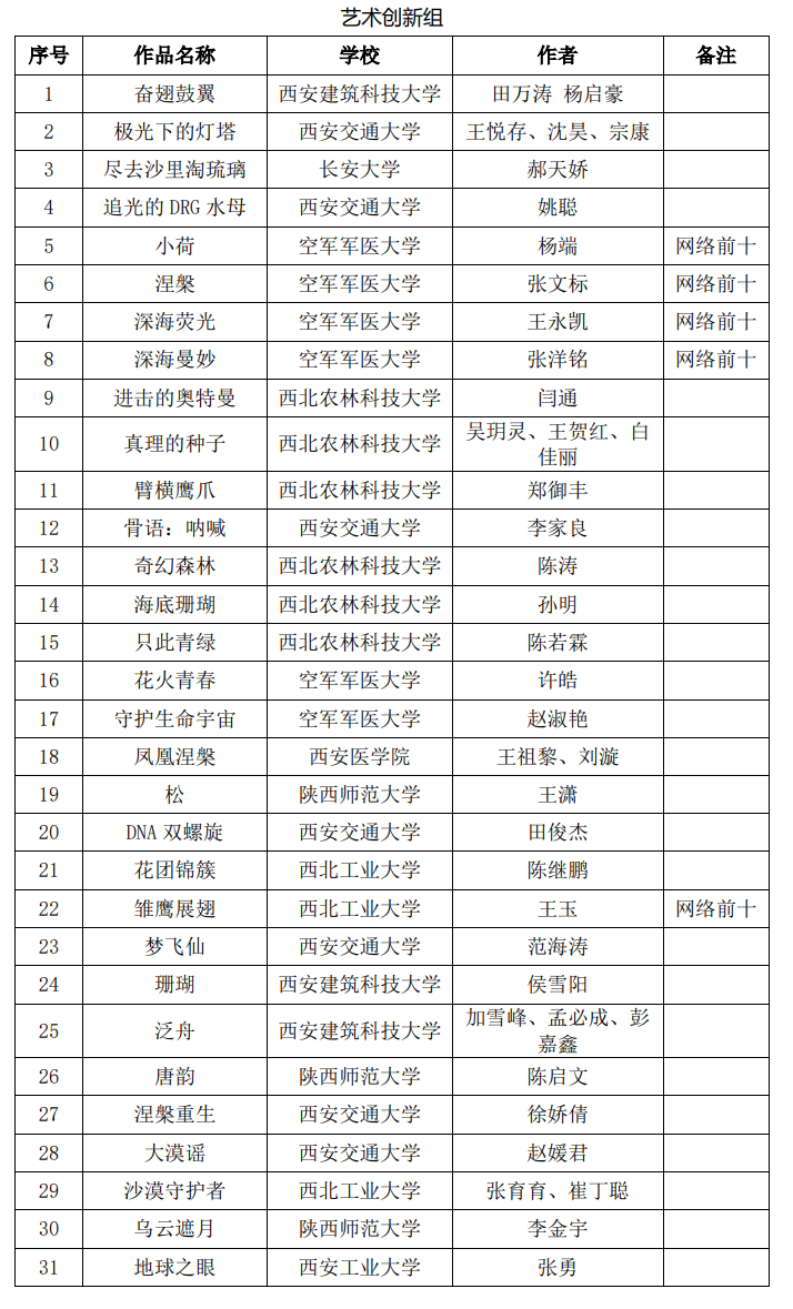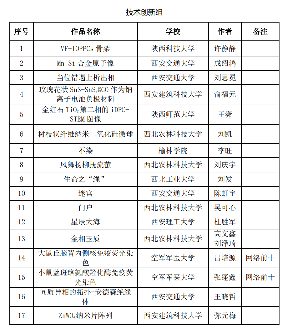 经过专业评委评审,从作品揭示的科学意义、图片质量和艺术性等方面进行综合评价,评选出58份作品进入决赛,其中技术创新组17份,艺术创新组41份(含网络投票入围作品10份,其中技术创新组1份,艺术创新组9份)。决赛将从该58份作品中评选出50份获奖作品。现将进入决赛作品名单公示如下(见附表)。