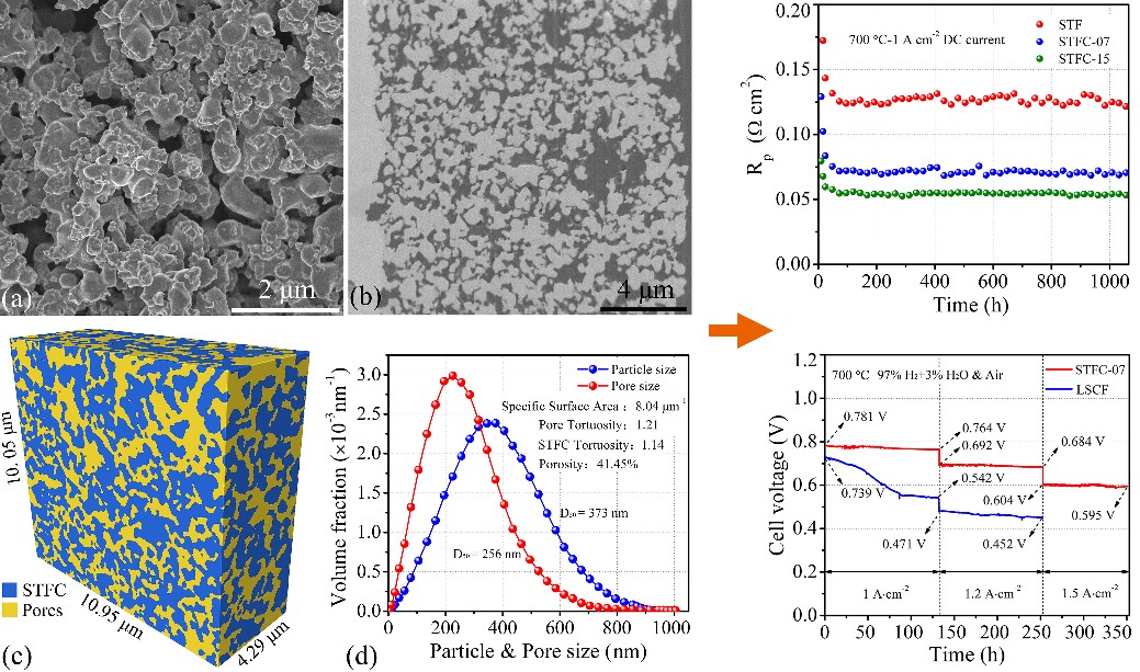 针对上述问题,诸侯快讯ok1122官网金属材料强度国家重点实验室李长久教授团队与美国西北大学Scott A. Barnett 教授团队进行合作研究,开发了一类新型SOC氧电极材料:Sr(Ti0.3Fe0.7-xCox)O3-δ (STFC),该氧电极材料不仅具有良好的电化学催化活性,而且具有优异的稳定性。在该工作中,研究人员通过B位Co掺杂改善Sr(Ti0.3Fe0.7)O3-δ 的性能,对该类材料的基本物理性能进行了系统的研究。通过FIB-SEM技术对多孔电极的微观结构进行了三维重组分析,并结合电化学性能及ICP测试技术研究了该类材料表面成分偏析现象;同时对电极材料的长期稳定性进行了深入研究。研究发现,少量Co掺杂,不仅可增加材料的电导率及氧空位浓度,同时可显著降低电极表面Sr的偏析,改善电极的氧表面交换系数及氧扩散系数,从而显著提升电极的催化性能,且电极的稳定性则不受任何影响。而且通过在700 °C,电流密度为1 A/cm2下的长期运行考核测试,发现由该氧电极构筑的SOC无论工作在燃料电池还是电解池模式下,STFC氧电极均表现出优异的长期稳定性。此外,STFC氧电极材料仅含Sr、Fe、Ti及少量的Co,不含任何稀土元素,其成本远远低于当前其他氧电极材料。该项工作对SOC高性能氧电极材料的开发与设计以及推动SOC的商业化应用具有重要意义。