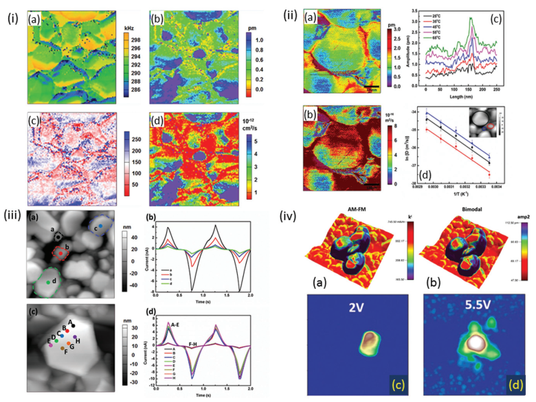 图四则包括了(i)由电化学应变显微镜在电池材料上的成像推出的扩散系数成像;(ii)扩散系数和温度的关系曲线;(iii)电池材料的导电性能成像;(iv)电极材料纳米颗粒的力学性能随电压的变化。