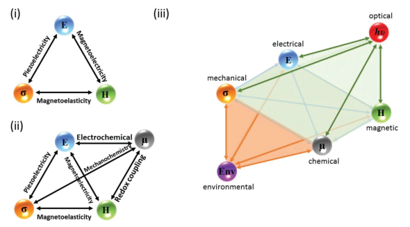 图一展示了(i)力-电-磁场耦合;(ii)力-电-磁-化学场耦合;(iii)力-电-磁-化学-光-环境场耦合。