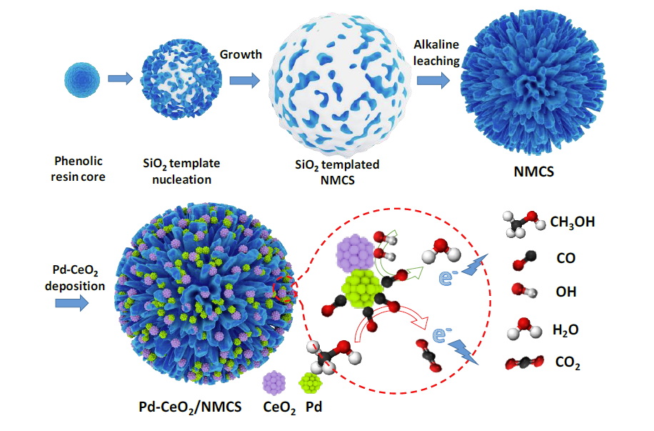 针对上述问题,诸侯快讯ok1122官网诸侯快讯ok133柳永宁教授课题组谭强博士提出了一种以多孔含氮碳球为载体(NMCS),CeO2纳米点为负载锚点,实现纳米级CeO2-Pd活性位高分散负载的催化剂制备策略。经过载量优化后的Pd20%-CeO2(20%)/NMCS催化剂在碱性条件下表现出超高的催化活性和稳定性:在CV测试中该催化剂的甲醇氧化峰值电流密度较商用PtRu/C催化剂提高5倍,并且表现出与PtRu/C催化剂相当的抗毒化性能。TEM、XPS和DFT结果表明,多孔含氮碳球丰富的孔结构极大地提升了Pd和CeO2的分散程度,明显细化了Pd颗粒尺寸,有效地增大了催化剂的电化学活性面积;碳载体中的掺杂氮和纳米CeO2点与Pd颗粒之间存在强烈的电子相互作用,该作用降低了Pd表面CO的吸附,提高Pd表面耐CO毒化能力,进一步提升了催化剂的催化活性和稳定性。该催化剂在纤维膜结构的直接甲醇燃料电池中也表现出了优于商用PtRu/C催化剂的性能。这项工作对今后发展高催化活性和稳定性甲醇燃料电池阳极催化剂具有重要指导意义。