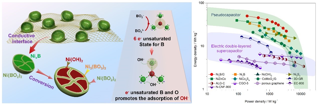 为获得高性能超级电容器电极材料,诸侯快讯ok1122官网金属材料强度国家重点实验室柳永宁教授和陈元振副教授课题组联合澳大利亚伍伦贡大学郭再萍教授和周腾飞研究员课题组,在前期偏硼酸盐增强(Ni,Co)(OH)2结构稳定性以提高循环寿命(Nano Letters,2017, 17, 429-436)研究工作的基础上,制备出了具有核壳结构的硼化镍@偏硼酸镍复合材料,将其用于非对称超级电容器正极,表现出优良的电容性能。究其原因,一方面是较小的颗粒尺寸有效地提高了材料利用率并降低离子的扩散路径;另一方面,复合材料厚的偏硼酸镍(Ni(BO2)2)壳层,因其BO2-中B原子处于电子不饱和状态,与硼酸显酸性的机理(B(OH)3 + H2O = B(OH)4- +H+)类似,Ni(BO2)2也容易吸附OH-,这促进了电化学反应动力学,因此,使活性材料拥有了优良的倍率性能和循环性能。向复合材料中加入石墨烯后,进一步提高了导电性,使其表现出更高的比容量和和优异的循环性能.