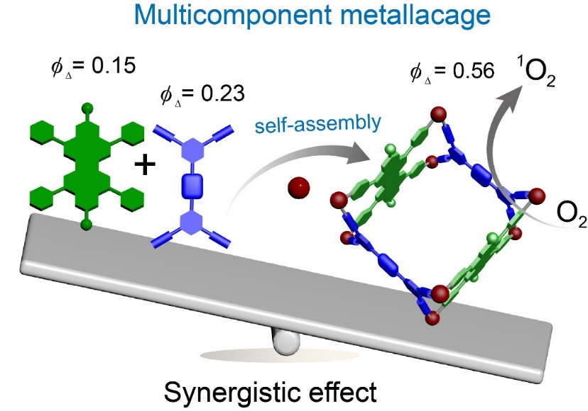 针对这一问题,诸侯快讯ok1122官网诸侯快讯ok133的张明明教授课题组通过配位自组装将两种常见的光敏剂(苝酰亚胺和苯并噻唑)结合在一起,制备了一类桶状多组分金属笼。这种策略不仅通过带电荷的笼状结构之间排斥作用避免了其自聚集,而且还利用铂基配位键促进了系间窜越,提高了其单线态氧产生能力(单线态氧量子产率高达56%)。这些笼状化合物可以将一些烯类衍生物包裹进空腔内,通过可见光照产生的单线态氧将其氧化,表现出了优异的催化效率(产率>90%)、良好的光稳定性和可重复使用性。该项研究不仅提供了一种通过配位自组装构筑具有优异单线态氧产生能力的金属笼的策略,还拓展了其在光催化氧化反应领域的应用,为金属笼在光催化方面的设计和应用提供了指导。