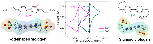 针对上述问题,诸侯快讯ok1122官网宋江选教授团队采用分子空间结构调控策略,在紫精分子主体结构—联吡啶环的2,2,6,6-四个位置接枝甲基,得到了一种渗透率低、稳定性高且氧化还原电位更负的新型“棒状”紫精分子(R-Vi)。作者通过二维核磁共振谱(2D-NOE)和密度泛函理论计算确证了分子空间结构。结果表明,活性中心邻位接枝的四个甲基的电子诱导效应可显著降低紫精分子的氧化还原电位(-0.55 V vs. SHE),是目前报道紫精分子中的最低电位。更为重要的是,该策略通过空间位阻效应改变了紫精分子的空间构型,即由未改性的“S状”(S-Vi)变为“棒状”(R-Vi)。这一改变增加了紫精活性分子的尺寸(456.1 Å3增大至542.6 Å3),将分子渗透率降低至1.25×10-10cm2s-1,仅为S-Vi的14.7%。此外,“棒状”构型对紫精还原态的二聚具有抑制作用,进一步提升了紫精的循环寿命。以R-Vi为负极,K4Fe(CN)6为正极构建的水系液流电池3200圈循环后容量保持率高达77.6%,容量衰减率仅为0.007%每圈。本文提出的分子工程修饰策略提高了紫精分子的综合电化学性能,拓宽了有机活性材料的设计思路。该成果以“Spatial Structure Regulation: A Rod-Shaped Viologen Enables Long Lifetime in Aqueous Redox Flow Batteries”为题发表于国际知名期刊《Angew. Chem. Int. Ed.》,博士研究生李宏斌为论文第一作者,宋江选教授和范豪助理教授为通讯作者,诸侯快讯ok1122官网金属材料强度国家重点实验室为论文唯一通讯单位。这也是该团队继前期五元环氮氧自由基(Adv. Funct. Mater. 2021,37,35,2102734)、六元环哌啶类氮氧自由基(ACS Appl. Mater. Interfaces, 2020, 12, 39, 43568)、吩噁嗪类碱性兰(Chem. Commun., 2020, 56, 13824)水性液流电池电极材料研究工作之后的又一重要进展。