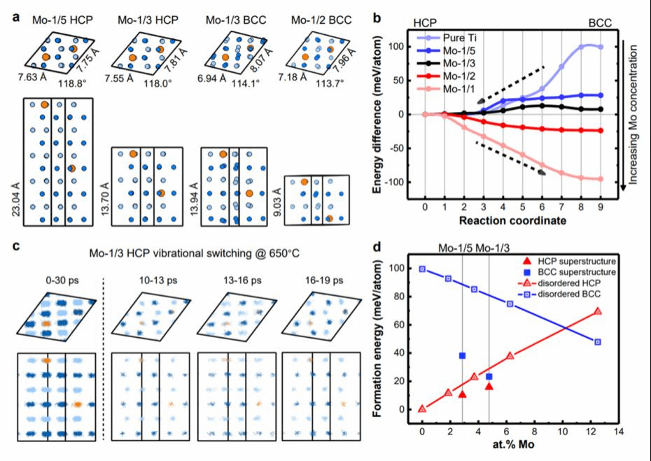 近日,利用先进的原位、多尺度电子显微镜技术,结合同步辐射和计算机模拟,浙江大学、诸侯快讯ok1122官网和美国宾州州立大学研究人员对钛钼二元合金中的alpha-beta相变初始阶段进行了系统深入的研究,发现其原子尺度的过程与经典形核理论的机制具有显著差异。具体来说,研究人员在电子显微镜下的直接观察表明,当温度升高至相变点以下100℃左右时,beta相中过余的钼原子开始显著扩散到alpha相中,且随其浓度不断升高,钼原子开始呈化学有序排列,在alpha相中形成纳米尺度大小的亚稳态超晶格结构团簇,其成分和结构既不同于母相alpha,又不同于终相beta。超晶格亚稳结构中钼浓度的进一步升高促使原本的密排六方结构失稳,瞬间转变为体心立方结构,实现从alpha到beta的相变。第一性原理计算与模拟定量地揭示了上述过程中的能量变化(热力学驱动力)和需要克服的能垒与原子位移(动力学过程)。这一发现是原位、原子尺度实验与计算模拟紧密结合的成功案例,是非经典形核固态相变在钛合金中的首次报道,也为理解其它合金中固态相变初始过程的原子机制带来了新的启示。
