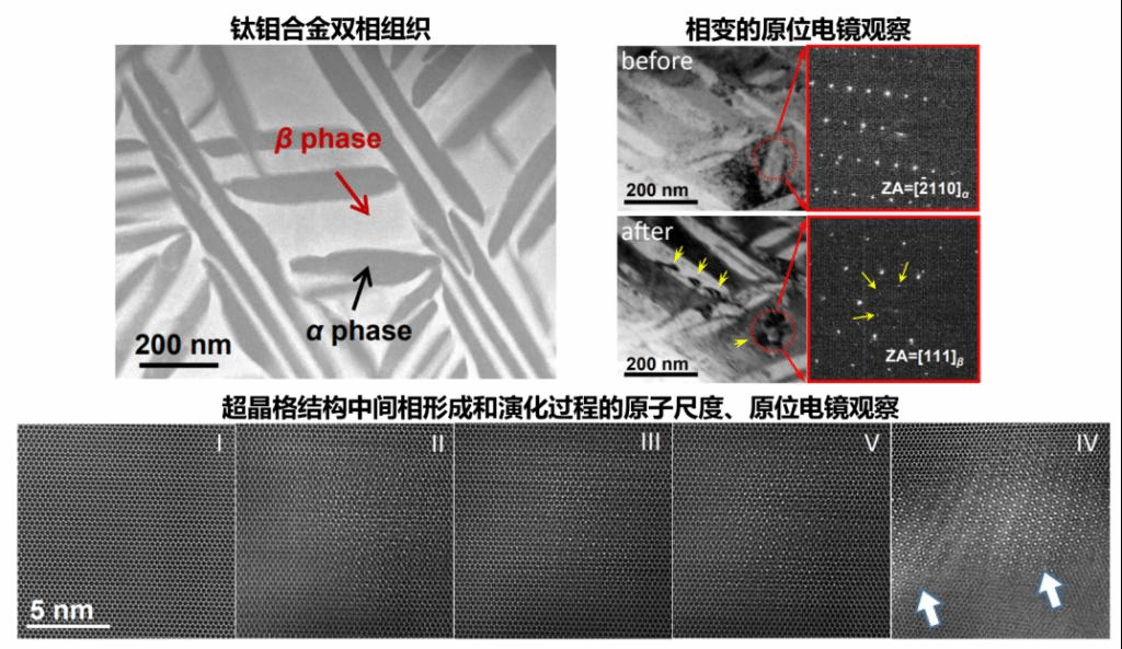 两相的比例以及各自的大小、形状和分布通常依靠相变来调控。相变,通俗来讲就是在外界条件的诱发下,从一个相到另一相的转变。相变理论中经典形核长大机制的假定是:新相起始于母相中源于热激活涨落出现的一个纳米尺度的新相胚胎,其成分和结构均与相图中预言的最终相变产物相同。然而实际的相变初始过程尺度小、时间短、可能性多,难以直接观测。钛合金中alpha固溶体和beta固溶体间的相变通常在高温下发生,前人虽有相关的研究报道,但对相变早期过程尚缺乏原位和原子尺度的直接观察和理解,对相变机制的认知并不清晰。