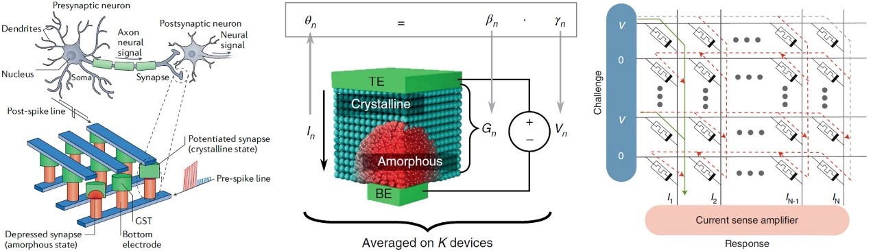 相变存储技术是利用基于硫族化物的相变材料在非晶相与晶体相之间的快速可逆相变以及两相间的电学或光学差异实现逻辑值“0”和“1”的区分与调控。目前最重要的相变材料主要是指介于碲化锗GeTe与碲化锑Sb2Te3之间的伪二元锗锑碲合金,例如Ge2Sb2Te5,GeSb2Te4等。该类材料具有稳定的晶体相与非晶相,能够室温下保持稳定超过10年,同时在操作过程中可实现纳秒级的相变调控。更重要的是锗锑碲合金的非晶相与晶体相之间存在高达3个数量级的电阻差异以及30%的反射率差异可实现“单节点-多逻辑值”识别。利用相变存储器阵列可构建数学矩阵或神经元突触网络,实现高能效比的存内计算或类脑计算,为研发“存算一体”芯片提供了重要载体,有望从根本上优化硬件架构,从而大幅提升算力。