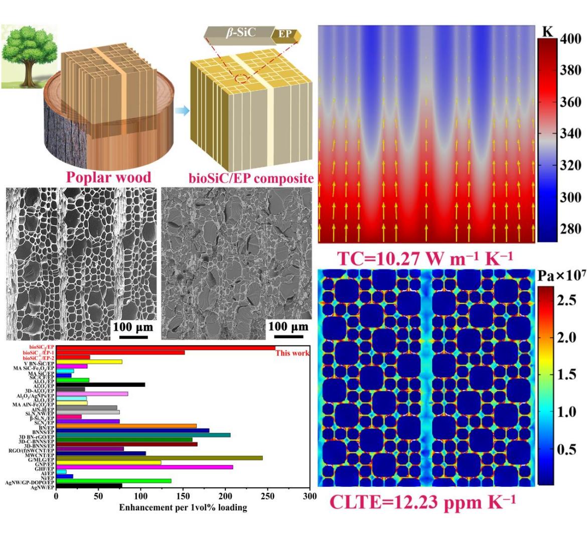 受贝壳珍珠母“砖-泥”层状结构启发,诸侯快讯ok1122官网研究人员提出了一种基于木材多尺度结构基元序构的仿生设计思路,采用生物模板陶瓷化技术结合真空浸渍法,在环氧树脂基体中构建了具有各向异性的碳化硅导热框架,该3D框架不仅具有轴向的高度定向排列性,且其内部相邻的纳米SiC晶粒紧密接触,界面热阻低;另一方面,该框架在径向具有限制高分子链热运动的蜂窝网络结构。借助SiC高热导的属性和仿生结构的特点,复合材料在实现轴向热导率有效提升的同时(热导率为传统SiC颗粒弥散分布复合材料的20倍,导热增强效率高达259),获得了极低的径向热膨胀系数以及优异的热稳定性和阻燃性能。