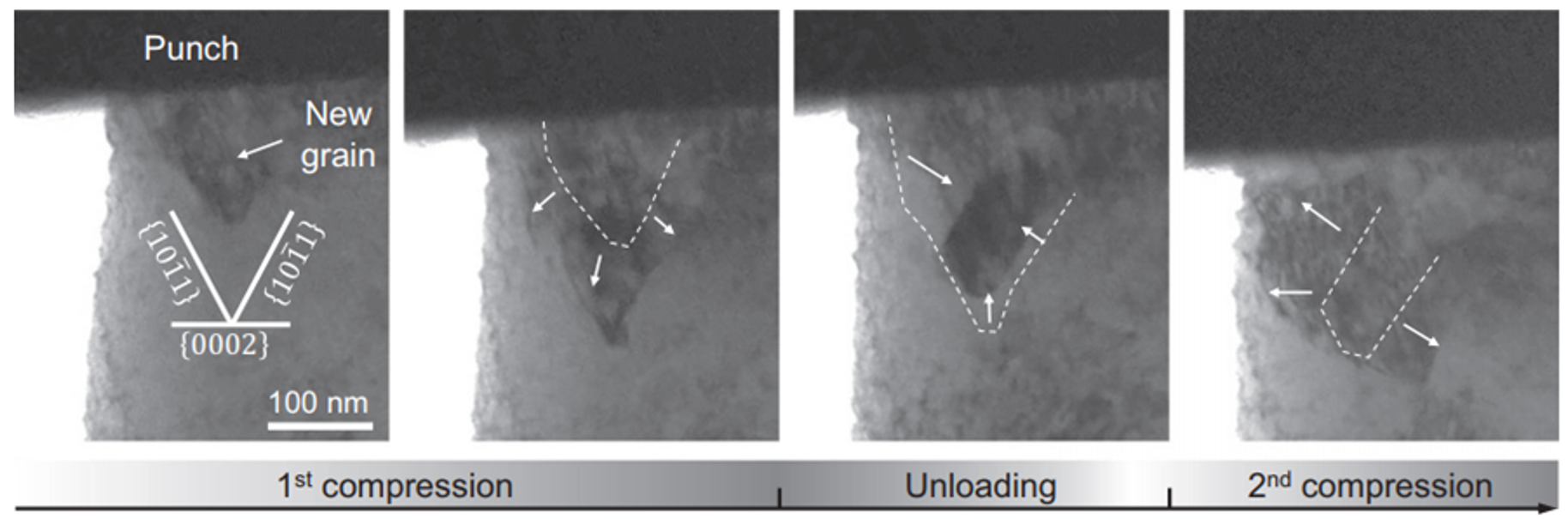 图2 新晶粒在加载时长大,卸载时缩小,二次加载时再次长大,反映了晶界的高可动性