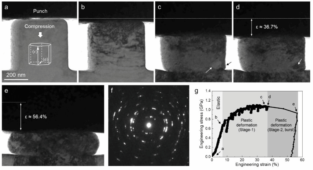 图1 亚微米镁单晶柱在<c>轴压缩下的变形过程。(a)初始样品;(b) 位错的形成和运动;(c) 在样品右下角形成的新晶粒(白色箭头);(d) 新晶粒中产生位错(白色箭头);(e)样品被压为扁平状;(f) 在扁平样品上采集的电子衍射。(g)应力-应变曲线显示出变形的三个阶段:弹性变形、塑性变形-加工硬化阶段、塑性变形-应变突跳阶段。