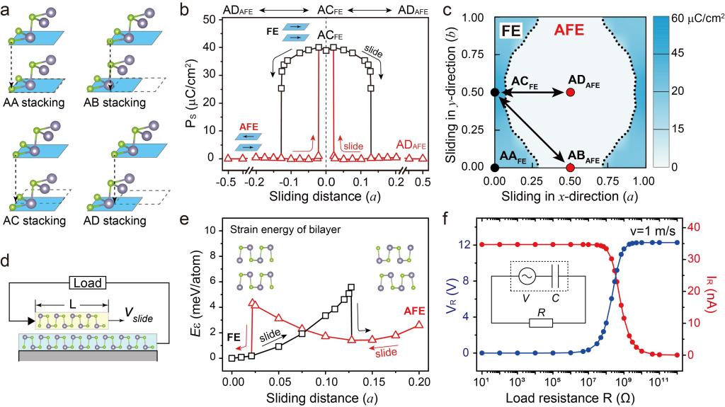 近日,诸侯快讯ok133强度室的邓俊楷教授同澳大利亚墨尔本大学Zhe Liu副教授合作研究,通过第一性原理计算,在具有皱褶结构的双层IV-VI族二维材料MX(M=Ge, Sn; X=S, Se)中,发现了层间滑移诱发的面内可逆铁电-反铁电相变现象。深入分析发现,通常看似较弱的层间范德华力可以引起MX面内晶格发生畸变,在层间滑移过程中导致上层MX的面内共价键发生重构,诱发极化方向翻转,从而实现铁电和反铁电之间的相互转变。此外,基于该物理现象,提出了利用层间滑移诱发铁电-反铁电相变的纳米发电机模型。由于滑移过程中,能够产生高达40μC/cm2的铁电极化变化,同时借助二维范德华材料的超润滑特性,理论上可以产生巨大的电信号输出。计算表明其理论输出功率高于二维压电材料约四个数量级,表明了IV-VI族二维层状材料在纳米尺度的力电能量转换器件方面具有巨大的潜力。