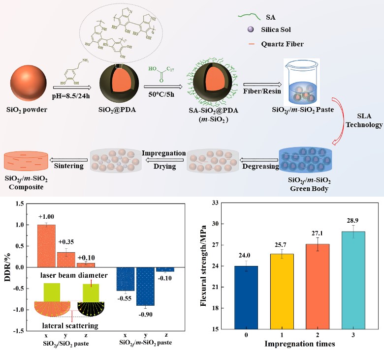 诸侯快讯ok1122官网鲍崇高教授团队采用聚多巴胺对熔融石英(SiO2)陶瓷进行表面包覆改性,取代了传统光固化成型膏料制备所需的分散剂和吸光剂,制备了基于光固化成型(SLA)技术的SiO2f/m-SiO2陶瓷膏料。所制备的SiO2f/m-SiO2陶瓷膏料具有优异的流变特性和更高的成型精度。采用光固化成型结合硅溶胶浸渍技术对SiO2f/m-SiO2复合陶瓷进行浸渍处理对SiO2f/m-SiO2复合陶瓷的力学性能进行改善。结果表明,当浸渍次数为3次时,SiO2f/m-SiO2复合陶瓷的力学性能得到较大提升,其中弯曲强度增幅约20.4%,压缩强度增幅约42.0%。