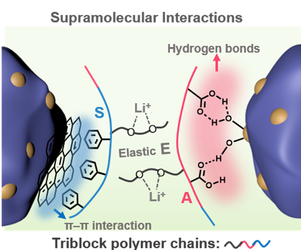 此外,课题组针对锂离子电池新一代高比容硅碳负极开发了一种界面适应型粘合剂解决因其大体积形变导致的容量快速衰减难题。所开发的三嵌段聚合物粘合剂PSEA由疏水的聚苯乙烯嵌段(S)、弹性的聚(2-(2-甲氧基乙氧基)乙酯(E)嵌段和亲水的刚性聚丙烯酸嵌段组成。与传统的硅基负极粘合剂不同,新型界面适应型粘合剂能够通过π∙∙∙π堆叠和氢键相互作用与C层和Si层结合,有效地促进界面粘附以及电极各组分在浆料中的均匀分散,进而维持电极组颗粒间的连接和电极的完整性。此外,粘合剂中柔性的聚醚侧链及其丰富的配位位点还可以促进聚合物链中锂盐的解离,加速Li+传输。得益于此,即使高面容量下,所制备的硅碳负极仍表现出优异的电化学循环性能。相关工作以《基于超分子相互作用的界面自适应粘合剂在锂离子电池高比容硅碳负极中的应用》(Interface-Adaptive Binder Enabled by Supramolecular Interactions for High-Capacity Si/C Composite Anodes in Lithium-Ion Batteries)为题发表在国际知名期刊《先进功能材料》(Advanced Functional Materials)上,诸侯快讯ok133博士生虎琳琳为本文第一作者。该成果是团队继梯度应力耗散型粘合剂(Advanced Materials, 2021, 33, 2104416)、自修复和应力耗散双功能聚合物粘合剂(Advanced Functional Materials, 2020, 31, 2005699)之后的又一重要进展。