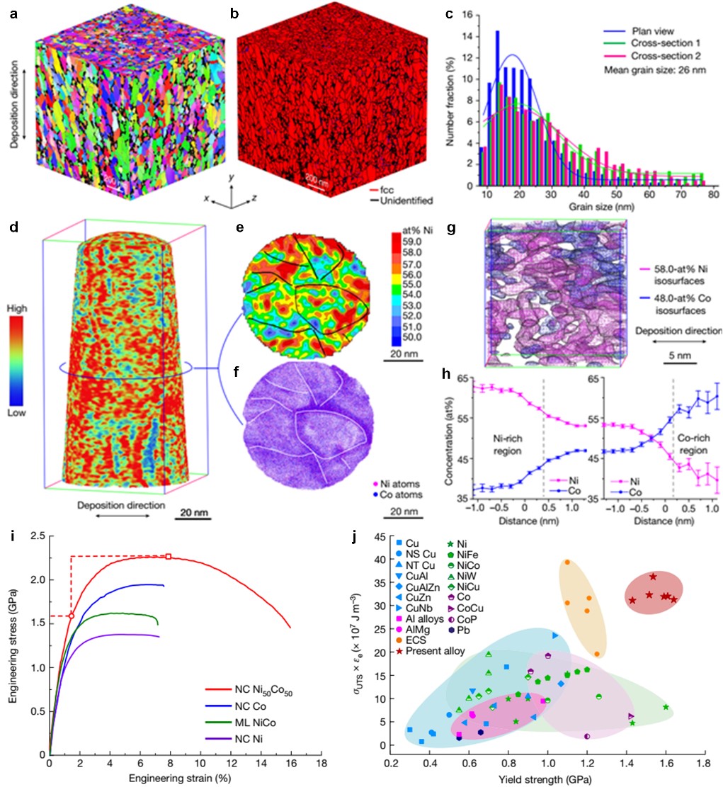 图1. Ni50Co50合金中由纳米尺度晶粒(a、b、c)和晶内多尺度成分起伏(d、e、f)构成的复合纳米结构。成分起伏呈三维网络分布(g),且不同成分的区域之间由“成分边界”分隔开来(h)。(i)Ni50Co50合金的拉伸工程应力应变曲线。图中还给出了纳米晶Ni、纳米晶Co和多层纳米结构NiCo合金在相同应变速率下的拉伸曲线作为参考和对比。(j)纳米晶金属材料屈服强度-强塑积关系图。在不同应变速率下测得的不同批次的纳米晶Ni50Co50合金的性能用红色五角星表示。