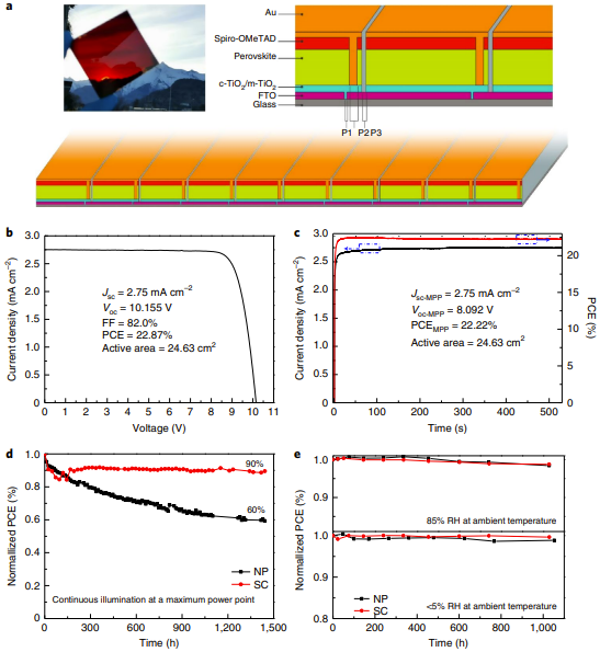 大面积钙钛矿太阳电池组件的效率差距,源于电荷传输层与钙钛矿界面以及大面积钙钛矿薄膜内部缺陷导致的光电损耗。上述团队利用菱形单晶TiO2纳米颗粒制备电荷传输层,并采用自主发展的真空抽气法制备高品质钙钛矿薄膜、消除了大面积薄膜中难以避免的针孔/裂纹缺陷,并借助TiO2纳米菱与钙钛矿薄膜界面的晶格高匹配度及高亲和力,有效降低了界面光电损耗,进而提高了小面积电池的效率(24.05%)和填充因子(84.7%)。据此,制备出有效面积24 cm2的大面积组件,认证效率达到22.72%,显著缩小了大组件与小电池的效率差距。