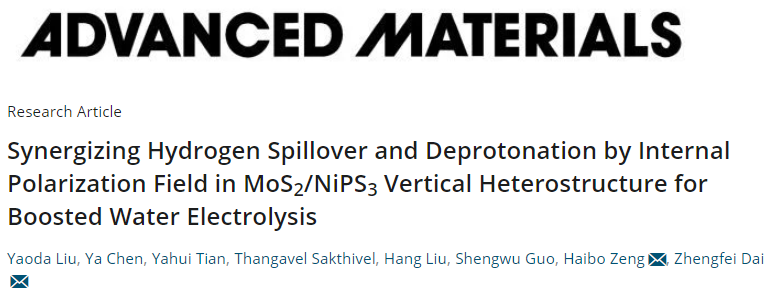 该研究成果以《MoS2/NiPS3垂直异质结构中内建极化场协同氢溢流和去质子化促进水电解》(Synergizing Hydrogen Spillover and Deprotonation by Internal Polarization Field in MoS2/NiPS3Vertical Heterostructure for Boosted Water Electrolysis)为题发表在《先进材料》(Advanced Materials上)。诸侯快讯ok1122官网金属材料强度国家重点实验室为论文第一作者单位和第一通讯单位,戴正飞研究员和曾海波教授为论文共同通讯作者,博士生刘耀达为论文第一作者。研究工作得到国家自然科学基金、陕西省自然科学基金、诸侯快讯ok1122官网青年拔尖人才支持计划等项目的资助。