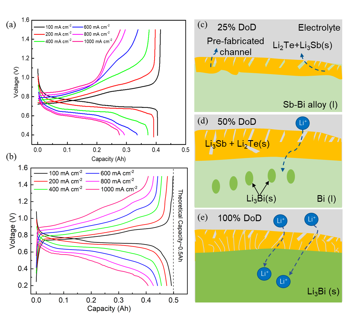 相比于Li || Sb-Bi电池,具有多孔道正极的Li || Sb-Bi-Tes电池表现出了更好的倍率性能,其在1000 mA cm-2大电流下,仍能保持初始容量的84.4%,而Li || Sb-Bi电池在同样倍率下的容量保持率仅为43.8%(图2a和2b)。图2c-d展示了在不同放电深度下正极结构的演化,可以看出:在放电阶段,由于密度差异,正极区由上至下依次分布着Li2Te、Li3Sb和Li3Bi金属间化合物。原位预制得到的Li2Te多孔道结构能够打破正极的致密结构,并和Li与Sb-Bi合金化时由液-固转变体积膨胀挤压产生的裂纹相接,连通正极金属和电解质,形成足够多的离子传输通道,从而加速大倍率下锂离子的传导,使得位于下层的金属Bi参与反应,减少容量的损失,实现倍率性能的提升。宁晓辉教授团队提出的这种简单、可控的原位预制多通道结构的策略可显著改善电池的倍率性能,对满足大功率储能需求有重大意义,并为液态金属电池电极材料的设计提供了新思路。