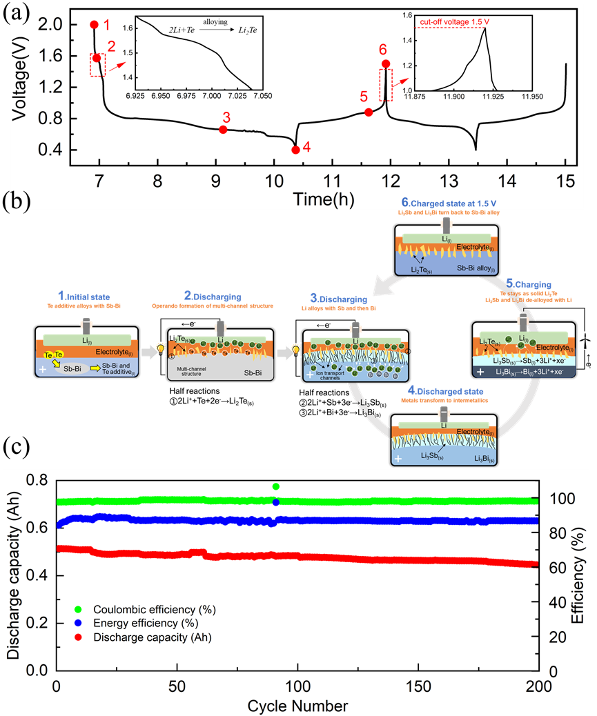图1 多孔道正极原位预制过程(a)前两个循环的充放电曲线;(b)充放电过程正极相变化;(c)Li || Sb-Bi-Tes5电池的循环性能示意图。