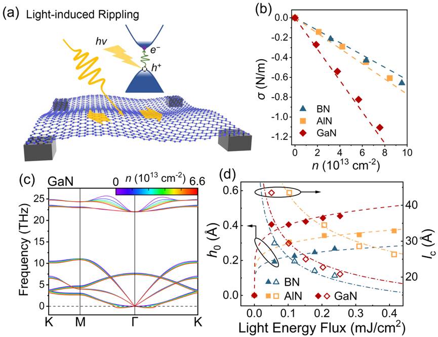 图:(a)光致褶皱示意图。(b)光致伸缩的理论与计算值。(c)光激发下面外长声学波模式的软化。(d)不同光照能量下的光致褶皱起伏度和波长。