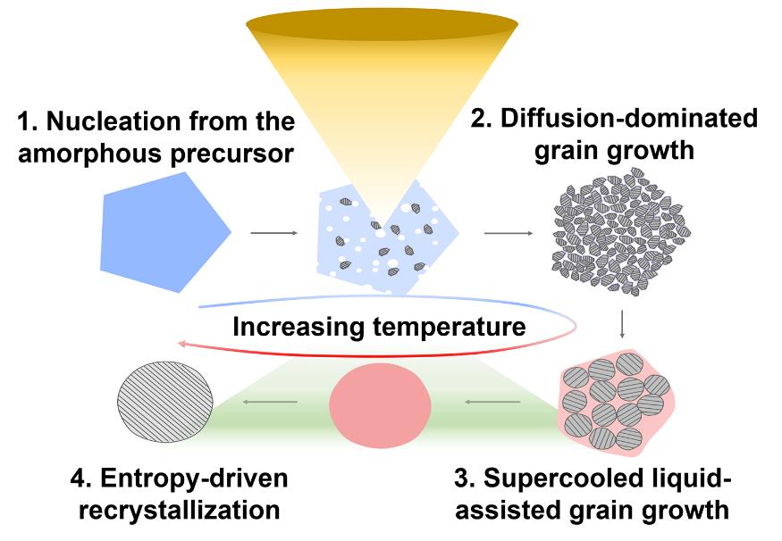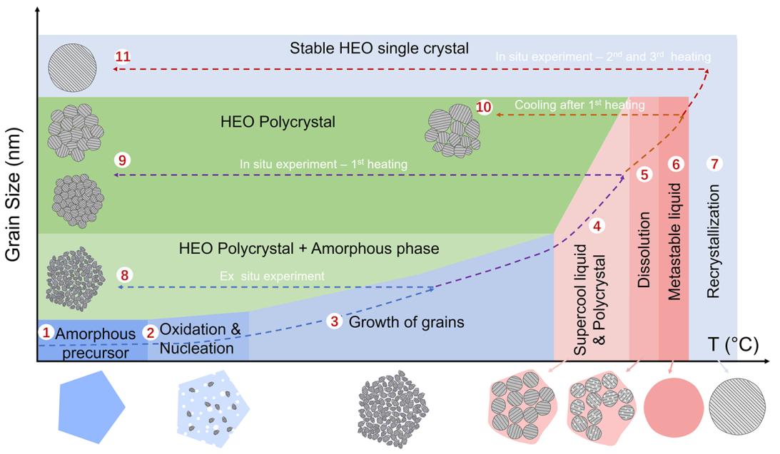 针对这一问题,诸侯快讯王红洁教授课题组和美国北卡莱罗纳州立大学、上海交通大学高文旆教授课题组合作,以自制高熵萤石型氧化物前驱体为研究对象,运用气相高分辨原位扫描透射电子显微技术,发现了聚合物前驱体形成高熵萤石氧化物的四个阶段(图1),包括低温段聚合物前驱体的氧化和形核(1→2)、扩散控制晶粒生长(1→3→8)、自生液相过冷度控制的晶粒生长(1→4→9/1→6→10),以及液相辅助成分均匀化后更高温度下的熵驱动重结晶和稳定化(1→7→11)(图2)。该工作从原子尺度揭示了高熵氧化物的形成机制,为进一步设计和制备具有可控形态、结构和性能的高熵氧化物陶瓷奠定了基础。