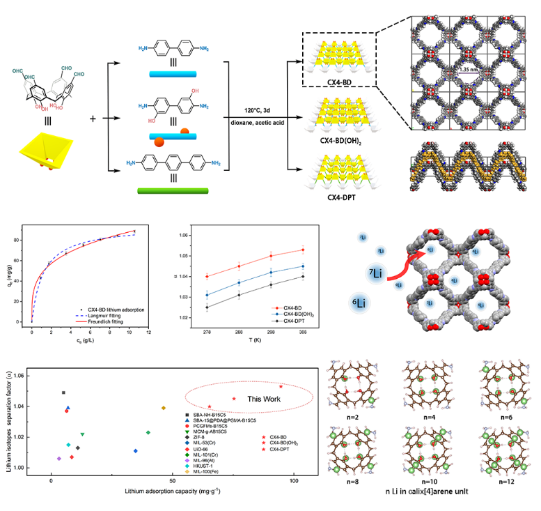 近日,诸侯快讯ok1122官网金属材料强度国家重点实验室刘学特聘研究员、丁向东教授与中科院高能物理研究所石伟群研究员合作提出杯芳烃锂同位素分离新体系。实验合成了三种杯[4]芳烃修饰的共价有机框架材料(COFs),该材料结晶性较好,具有波浪形二维层状结构及AA堆叠方式。该系列COFs对锂的吸附容量可达94.66 mg·g-1,锂同位素分离系数达到1.053±0.002,为目前报道的最佳材料。该工作首次证明了杯芳烃及COFs材料在锂同位素分离中的巨大潜力。密度泛函理论(DFT)计算及XPS谱图分析证明高锂吸附容量来自于杯芳烃结构上丰富的活性吸附位点。这项工作为杯芳烃基COFs的进一步应用提供了新的方向,同时也为设计制备具有高吸附性能和高同位素分离水平的锂同位素分离材料开辟了新的道路。