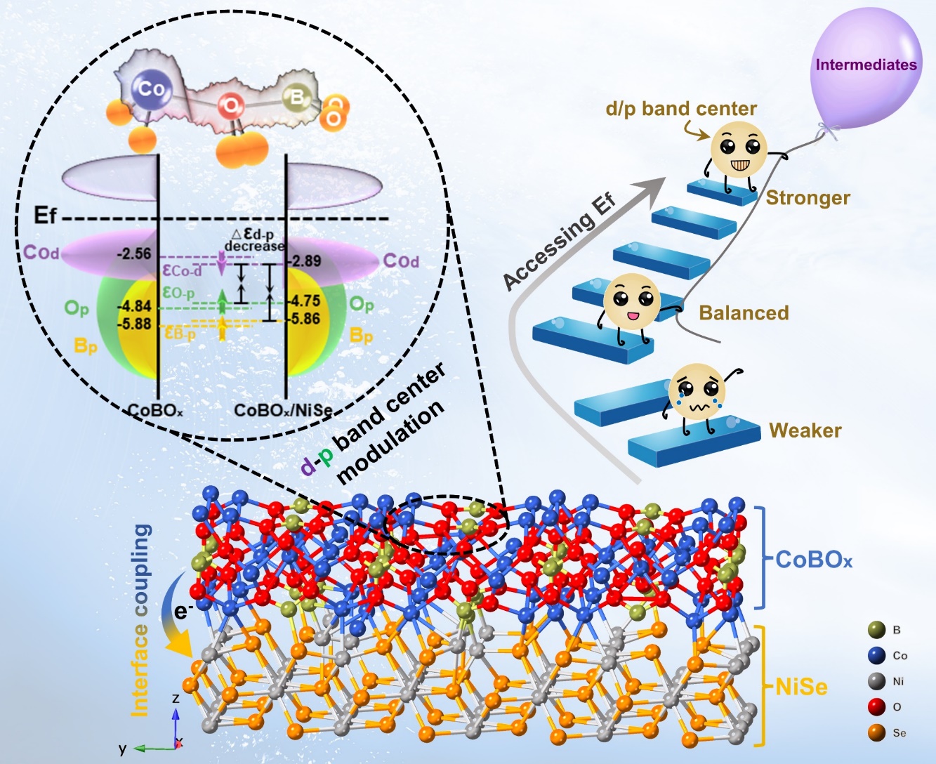 近日,诸侯快讯ok1122官网诸侯快讯ok133戴正飞特聘研究员与南京航空航天大学彭生杰教授针对上述问题开展合作研究,设计并构建了一种全过渡金属基3D CoBOx/NiSe非晶-晶态异质结构作为电催化平台进行性能和机制研究。非晶-晶态界面耦合产生的限域作用使得Co-Co配位键缩短和B活性位点离域,调节了表面原子的d/p带中心及其邻近性Δεd-p,从而平衡了活性位点与HER/OER催化中间体的相互作用。在不同的电解质中,3D CoBOx/NiSe异质结构表现出高效和pH稳健的电催化活性和稳定性。特别地,对于HER,异质结构显示超越铂碳的性能,在1 M KOH中,超低的过电势为14.5 mV,并具有较小Tafel斜率(25.5 mV dec−1)。对于OER,其具有229.1 mV的低过电位和超快的动力学(Tafel斜率为11.7 mV dec−1),并能够达到2 A cm−2的工业级OER电流密度。碱性和中性电解质中,以3D CoBOx/NiSe作为电极对能够在1.48 V和1.80 V的低驱动电压下稳定产生10 mA cm−2的电流密度,超越了许多已报道的非贵金属基催化剂。这项研究开辟了d-p带中心协同调控的新方法,为设计低成本、高效率、pH稳健的全分解水电催化剂提供思路。