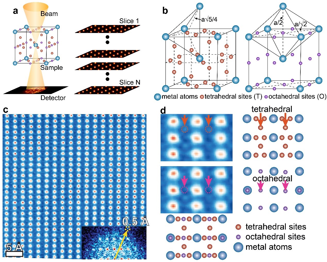 在体心立方(BCC)金属中引入间隙元素(例如铁中固溶氧、碳、氮),是大幅提升强度的有效方法。近期,刘畅等通过将大量间隙氧原子(12 at%)固溶进TiZrNb系中熵合金,将其屈服强度提升至接近理论强度的4.2 GPa(C. Liu et al.Nat. Commun.13, 1102 (2022))。固溶强化效果与间隙原子在晶格中的位置有关。教科书中认为,对于BCC间隙固溶体(比如碳溶于铁而形成的钢),间隙原子位于BCC晶格的八面体间隙位置而不是空间更大的四面体间隙位置(其半径约为前者的两倍),引起不对称的晶格畸变,有效阻碍位错的运动从而提升材料强度。然而,在透射电镜下很难直接观察到金属晶格中原子序数很低的间隙原子,且易受样品表层杂质(如氧化层)的干扰。对间隙原子及其所占位置直接而可靠的观察,将有助于揭示间隙固溶BCC合金的结构特性,促进新一代高强度金属材料的研究与开发。