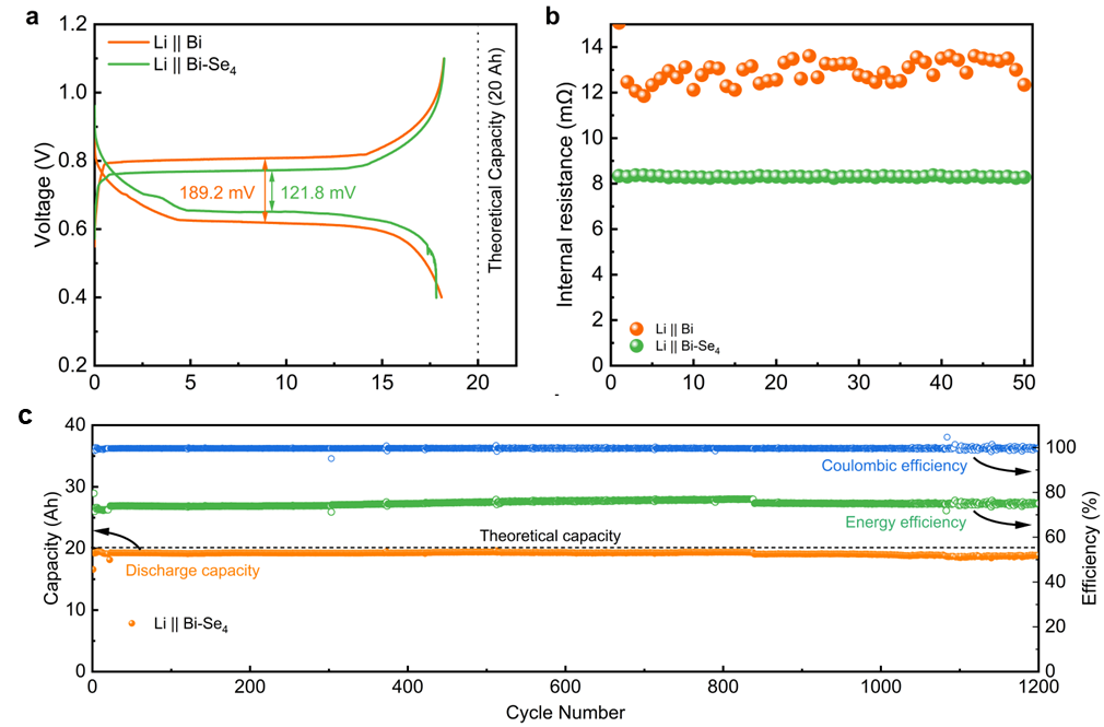 图2 20 Ah级别电池的电化学性能。(a)Li || Bi与Li || Bi-Se4电池充放电曲线和(b)全充电态直流内阻;(c)Li || Bi-Se4电池的循环性能(500℃)。