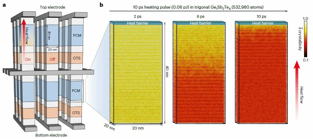 图1 三维堆叠相变存储芯片中相变单元的的原子模拟,颜色深浅代表晶体熔化程度。