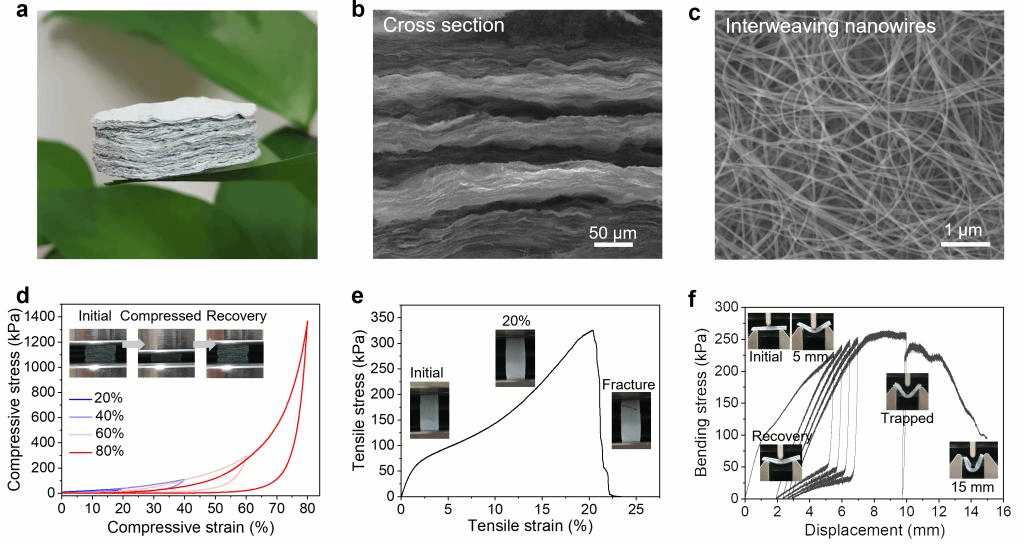 图1 柔而强的陶瓷气凝胶:a) 宏观形貌; b) 截面层状结构; c) 层内纳米线高度交联; d) 压缩回弹性及高承载; e) 弹塑性拉伸变形及高拉强度; f) 可恢复的弯曲变形及高弯曲强度