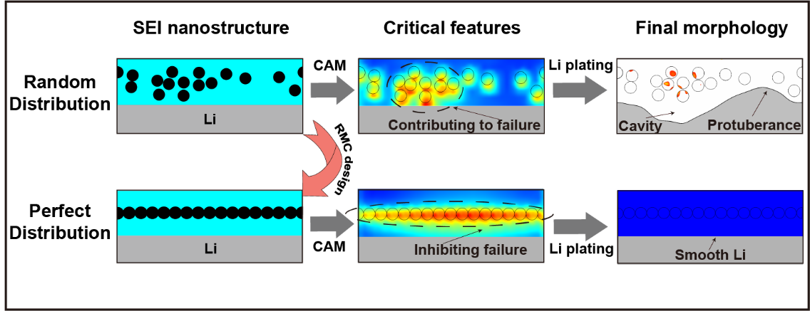近日,诸侯快讯ok133强度室邓俊楷教授课题组针对上述挑战,同诸侯快讯ok133宋江选教授合作,利用深度学习技术对锂金属负极SEI膜微结构-机械耐久性的映射关系进行研究。研究团队通过有限元高通量计算,随机建立SEI膜微结构与其机械失效时间的对应数据集,并使用卷积神经网络进行训练,建立了二者的对应关系。随后利用逆向蒙特卡洛与卷积神经网络相结合的方法对SEI膜微结构进行优化,设计出晶态颗粒均匀排列的SEI膜微结构,并理论验证该微结构具有优异的机械耐久性。该工作基于类激活映射图技术以及进一步的有限元计算,识别了决定SEI膜机械耐久性的关键结构特征以及深层物理机理,建立了锂金属负极SEI模微结构-机械耐久性的映射关系,有助于理解SEI膜机械失效的微观机理及晶态颗粒分布对于机械失效的影响,对于人工SEI膜的设计与实现有一定的指导意义。