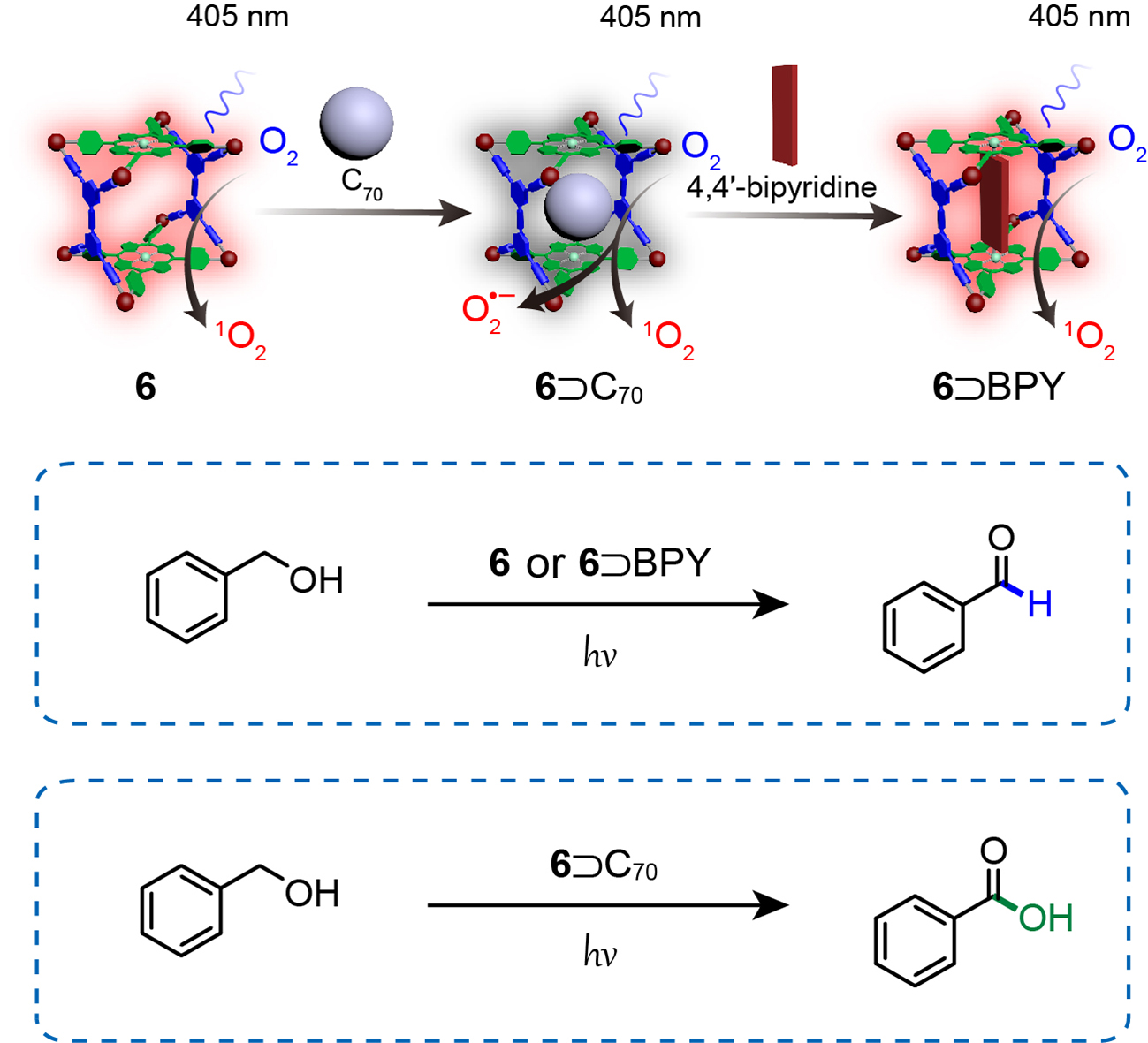 针对这一问题,诸侯快讯ok1122官网诸侯快讯ok133张明明教授课题组通过配位自组装,构筑了一类基于卟啉的多组分金属笼,并通过金属笼的主客体性质来调控活性氧物种的产生,实现了对苯甲醇的选择性光催化氧化。作者研究发现,在405nm光激发下,金属笼(6)能够有效地通过激发态能量转移的方式生成单线态氧(1O2)。然而,当金属笼(6)与C70结合形成主客体配合物(6⊃C70)后,电子转移途径被打开,从而促进了超氧阴离子自由基(O2·−)的产生,同时生成1O2与O2·−。接着,在配合物6⊃C70中引入4‘4-联吡啶(BPY)时,可以与金属笼配位形成稳定性更高的配合物(6⊃BPY),将C70从空腔中挤出去,恢复高效的1O2产生能力。接下来作者对苯甲醇光催化反应进行了探究。结果表明,配合物6和6⊃BPY可以有效的将苯甲醇氧化为苯甲醛,而配合物6⊃C70则可以将其氧化为苯甲酸,该类反应的产率与选择性都可以达到90%以上。本研究不仅展示了一种可调控的基于金属笼状化合物的主客体识别模式,还探讨了其在选择性光催化中调节活性氧(ROS)生成的潜力。近日,该研究成果以《卟啉金属笼主客体化学调控活性氧的生成用于选择性光催化》(Guest-Regulated Generation of Reactive Oxygen Species from Porphyrin-Based Multicomponent Metallacages for Selective Photocatalysis)为题发表在国际化学领域权威期刊《德国应用化学》(Angewandte Chemie International Edition)上。该论文第一作者为西安交大诸侯快讯ok133博士生高科、硕士生程颖与张泽远副教授,通讯作者为西安交大诸侯快讯ok133张明明教授、张泽远副教授与尚晓博副教授。西安交大金属材料强度国家重点实验室是论文第一通讯单位。