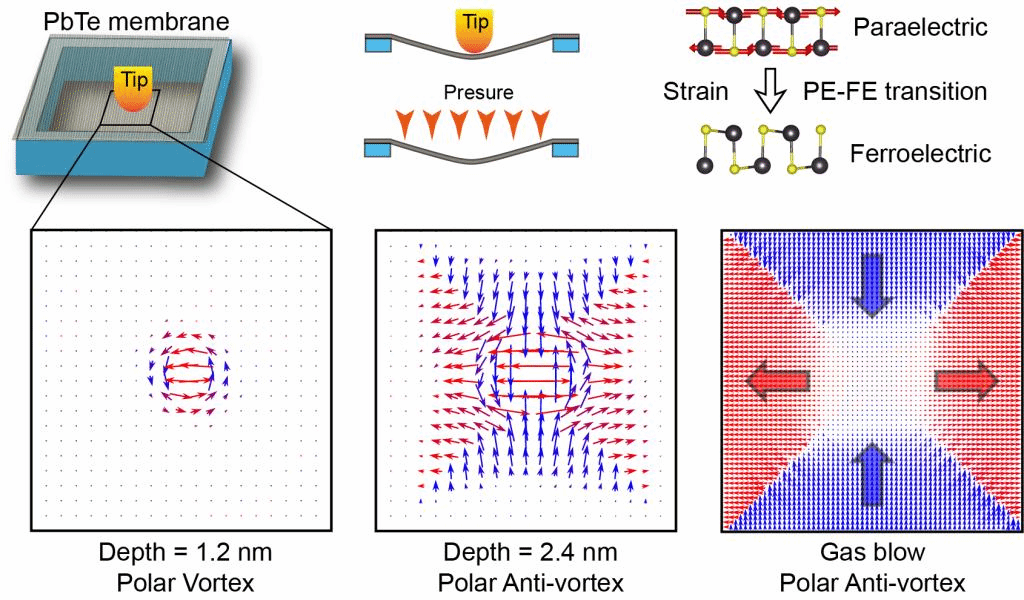 最近,诸侯快讯ok1122官网诸侯快讯ok133的邓俊楷教授课题组,与航天学院的刘益伦教授和墨尔本大学的刘哲教授通力合作,通过多尺度模拟方法,将铁电极化拓扑结构及其调控拓展到二维铁电材料中。首先,研究团队利用第一性原理计算,发现二维PbX(X = S,Se,Te)材料可通过应变诱发“顺电-铁电”相变,并确定了材料的“应变-极化”相图;随后,基于二维PbX材料具有优异的面外屈曲变形的特点,研究团队采用基于深度学习势的大规模分子动力学,模拟“纳米压痕”实验,发现二维PbX材料在复杂应变场条件下可诱发“类斯格明子”的极化涡旋拓扑结构;最后,利用有限元模拟,通过设计不同几何压头的纳米压痕或压力鼓泡等机械载荷导致的复杂应变场,在二维PbX材料中实现了可回复的极性涡旋、反涡旋和通量闭合畴等多种二维曲面铁电极化拓扑结构。研究工作证明了利用复杂应变场,可在柔性二维铁电材料中,设计各种可逆的极化拓扑结构,有望为开发基于新型二维铁电材料的高密度存储器和传感器等功能器件提供新的思路。