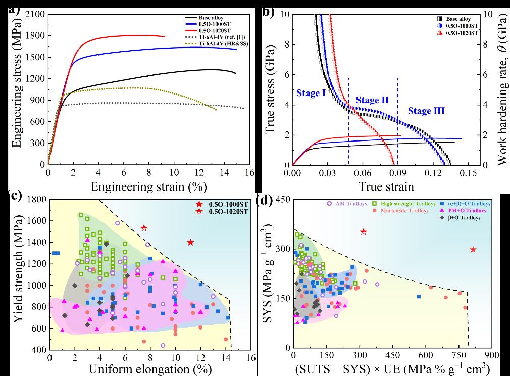 图2. 间隙氧强化的纳米孪晶马氏体Ti-2.8Cr-4.5Zr-5.2Al合金水冷后的室温力学性能与商业Ti-6Al-4V合金、马氏体钛合金、高强钛合金、增材制造钛合金、(α+β)+O钛合金、β+O钛合金和粉末冶金+O钛合金的力学性能、比强度和比韧性对比