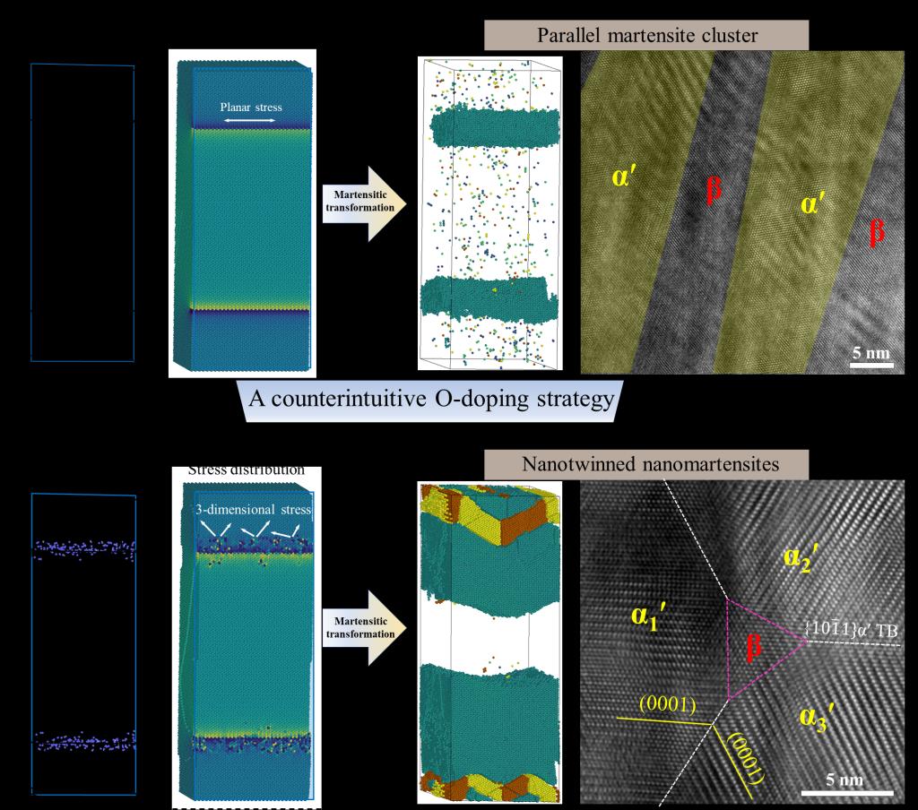 图1. 基于O-位错交互作用形成的纳米孪晶马氏体Ti-2.8Cr-4.5Zr-5.2Al合金的分子动力学模拟和相应的微观结构