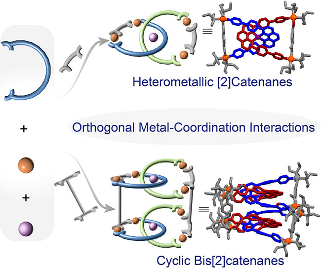 因此,诸侯快讯ok1122官网诸侯快讯ok133张明明教授课题组利用Cu/菲罗啉单元与Pt/吡啶/羧酸的正交自组装,高效制备了一系列双金属核[2]索烃和环状双[2]索烃,其结构得到了单晶X射线衍射的验证。该工作首次报道了由正交金属配位自组装制备的刚性环状双[2]索烃,为利用索烃来构筑高阶机械互锁结构提供了新的思路。之后作者发现这类结构具有广谱的抗菌性能,为高阶超分子结构在生物医学领域的应用提供了借鉴。近日,该研究成果以《基于正交金属配位作用的异核双金属[2]索烃和环状双[2]索烃的高效自组装》(Highly Efficient Self-Assembly of Heterometallic [2]Catenanes and Cyclic Bis[2]catenanes via Orthogonal Metal-Coordination Interactions)为题发表在国际化学领域权威期刊《德国应用化学》(Angewandte Chemie International Edition)上。该论文的第一作者为西安交大诸侯快讯ok133博士生冯倩、西安交大前沿学院博士生丁睿与西安交大诸侯快讯ok133侯亚丽博士,通讯作者为西安交大诸侯快讯ok133张明明教授,西安交大金属材料强度国家重点实验室是论文第一通讯单位。